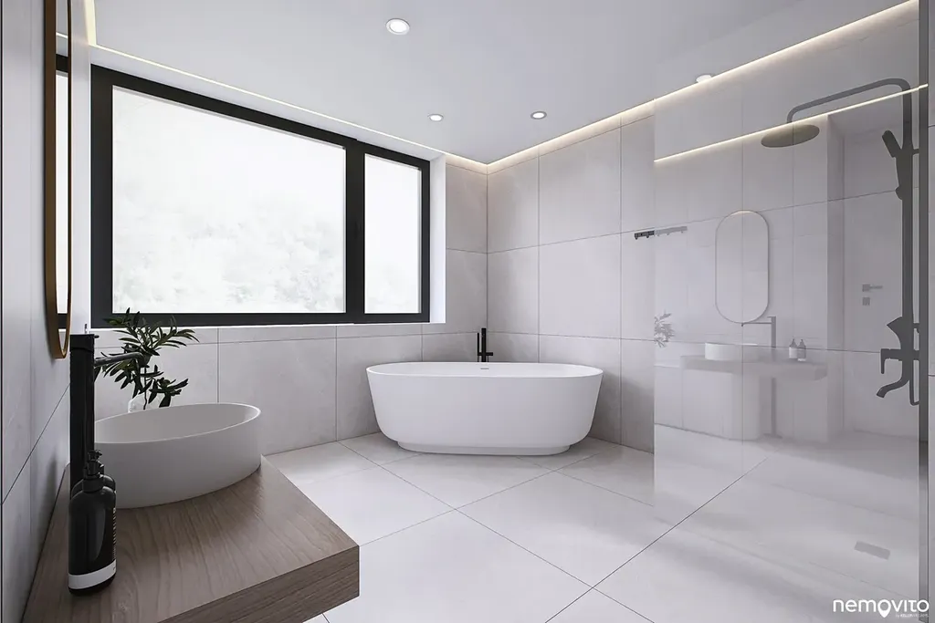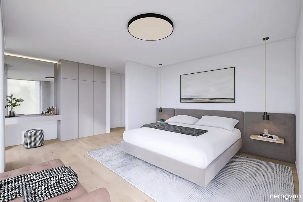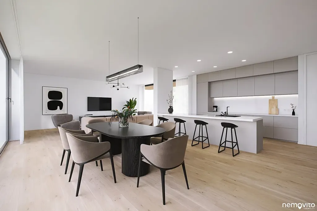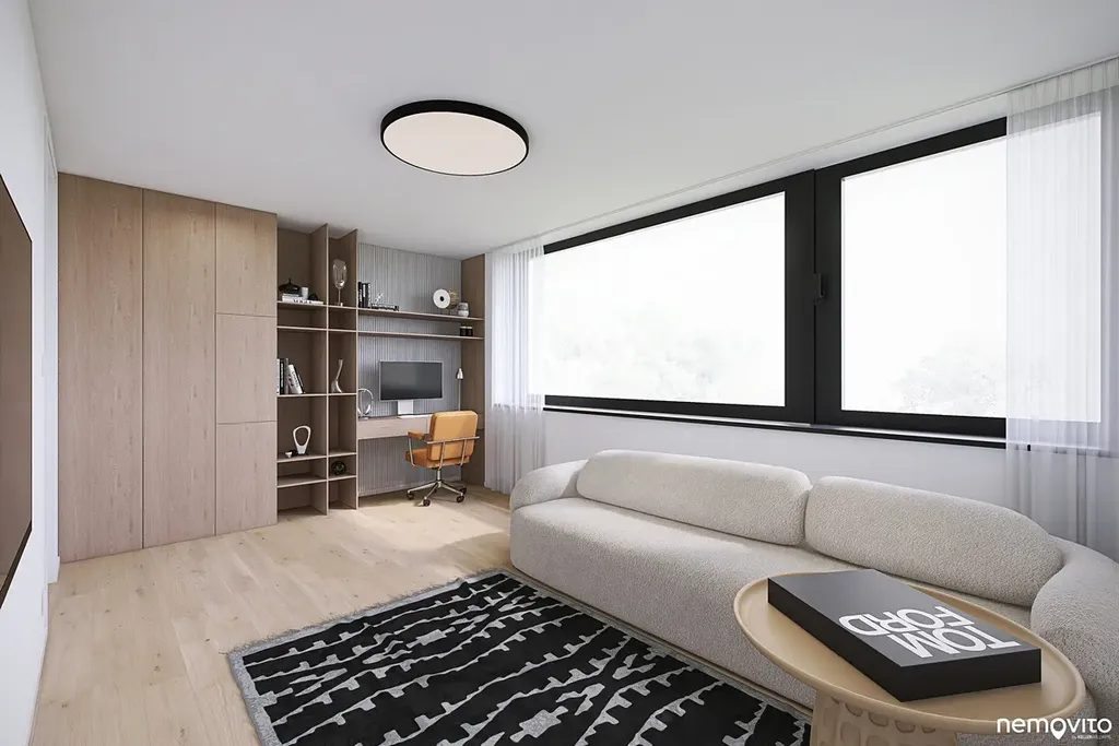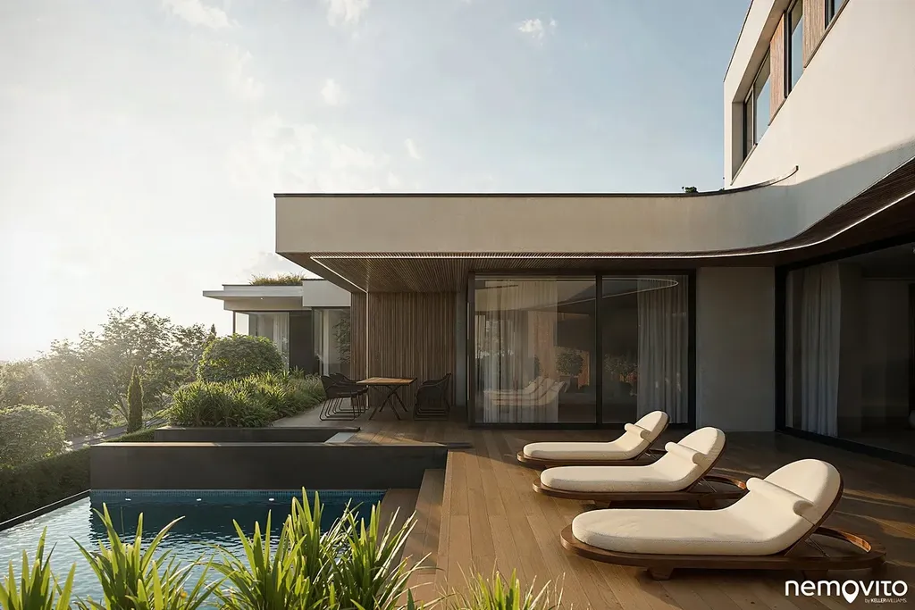 Dům o dispozici 6+kk (462 m2 plochy) nabízí ve 3 podlažích komfort početné rodině, který nespočívá pouze ve velkorysé ploše, ale taktéž smysluplně řešené dispozici se spoustou úložných prostor. Vila, která svým pojetím navazuje na myšlenky funkcionalismu, hojně pracuje s velkou prosklenou plochou, která prostřednictvím precizně orientovaných výhledů těží maximum z konkrétního místa. V úrovni příjezdu se nachází garáž (2 auta + moto), místnost na sportovní náčiní a sklady. Druhému podlaží dominuje více jak 80 m2 obývák s terasou k bazénu a pokoj pro hosty. Poslední podlaží je věnováno ložnicím.