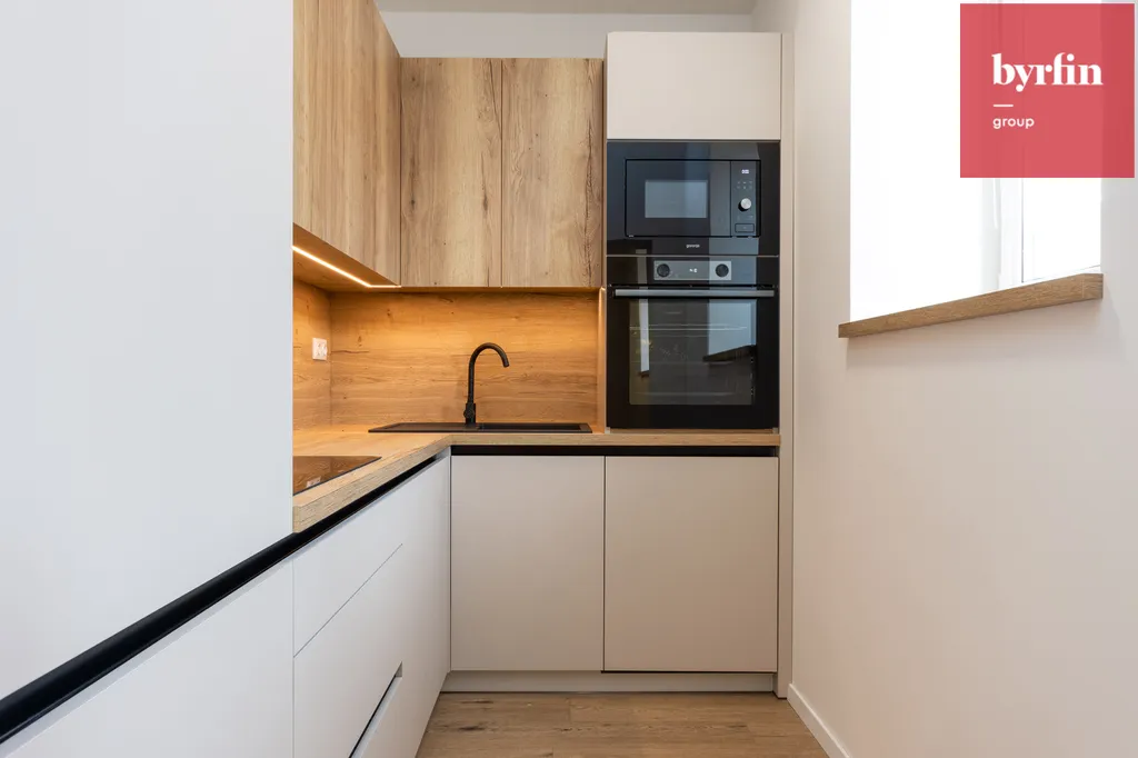 Na podlaze je kvalitní vinyl v dekoru dřeva, který ladí s kuchyňskou linkou. Interiér doplňují elegantní interiérové dveře v matné šedé barvě. Kuchyňská linka v dekoru dubu Halifax a kašmírově šedé barvě působí nadčasově a prémiově. Je plně vybavena spotřebiči značky Gorenje včetně myčky a lednice.