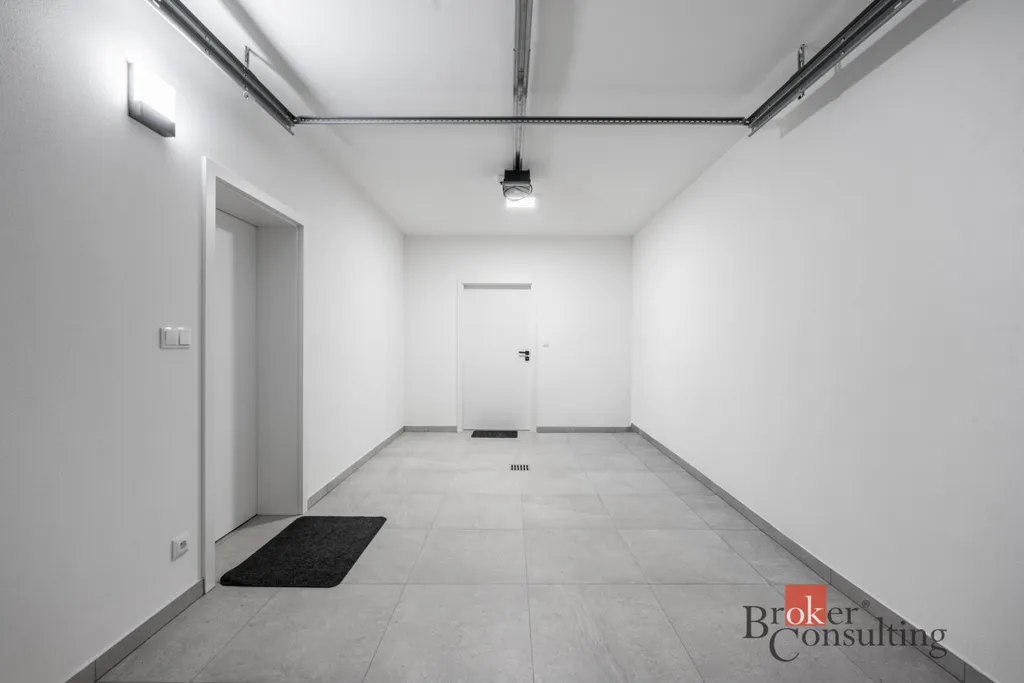 bez starostí. Anhydritové podlahy přinášejí teplo a komfort, hliníková francouzská okna světlo a nadčasový vzhled. Každá místnost má rekuperaci s Wi Fi ovládáním, dům je připraven na klimatizaci, připojený přes optický kabel a vybavený elektrickými hliníkovými žaluziemi. O teplo se stará kondenzační plynový kotel, v garáži je 400V zásuvka. Zahrada s terasou z WPC dřevoplastových desek je připravená k relaxaci.