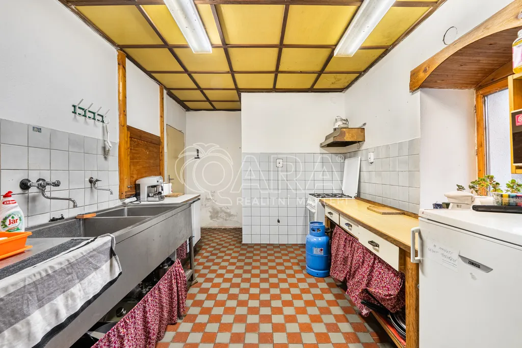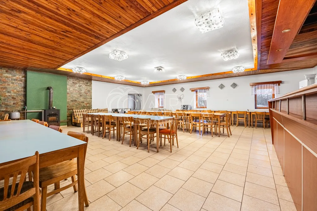 V přízemí se nachází vstupní chodba, dva sklady, kuchyň, prostorný společenský sál s barem a krbovými kamny, dámské a pánské toalety, sprchový kout a technické zázemí.