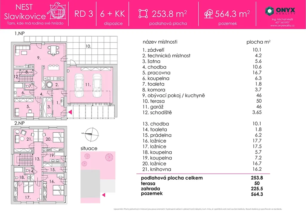 Celková užitná plocha domu činí 253,8 m². Součástí nabídky je terasa ze sibiřského modřínu o velikosti 50 m² a na ni navazující zahrada o výměře 227,2 m². Pozemek má celkovou rozlohu 561 m².