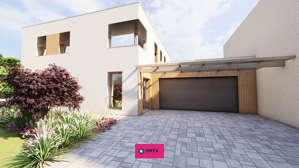 Nabízíme ke koupi velký moderní, nízkoenergetický - ve Třídě A - rodinný dům se dvěma plnohodnotnými podlažími, rovnou střechou a propracovaným dispozičním řešením. Dům disponuje šesti obytnými místnostmi, velkým obytným prostorem (obývací pokoj s kuchyní o velikosti 46 m² s prosklenou stěnou do "L" s přímým vstupem na terasu s HS portálem), třemi koupelnami, třemi toaletami a dvougaráží. Praktickým bonusem je samostatná prádelna s velkým francouzským oknem.