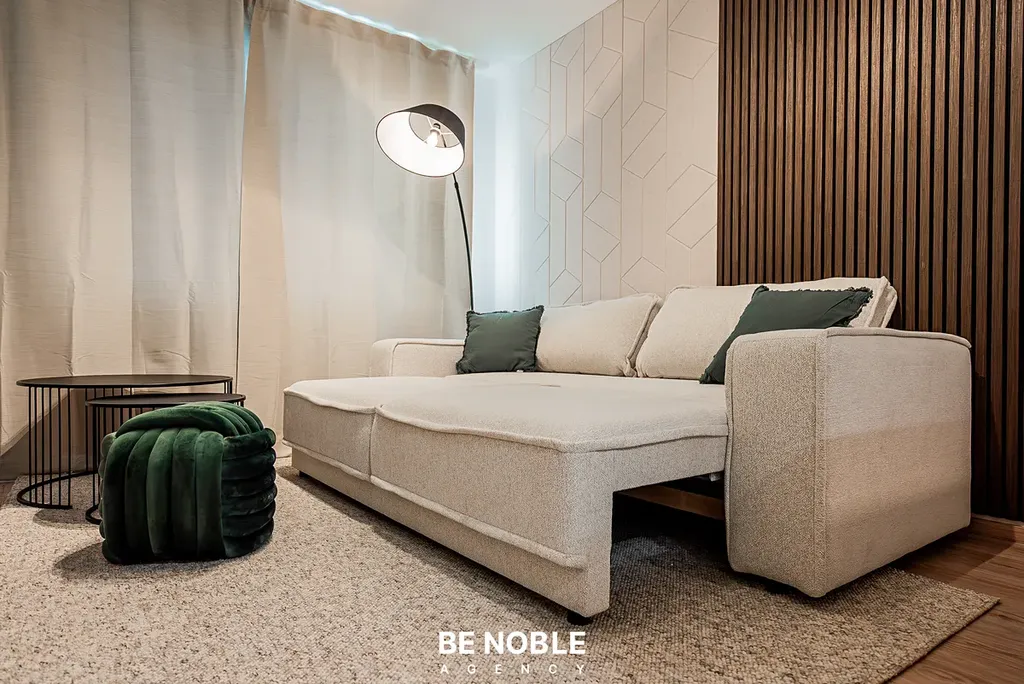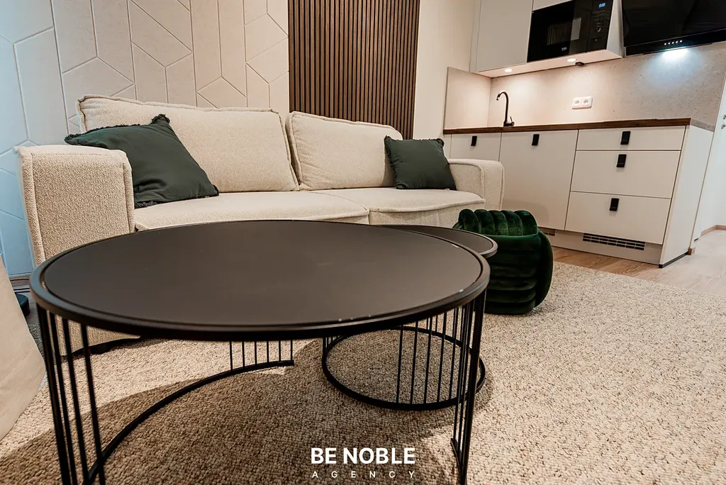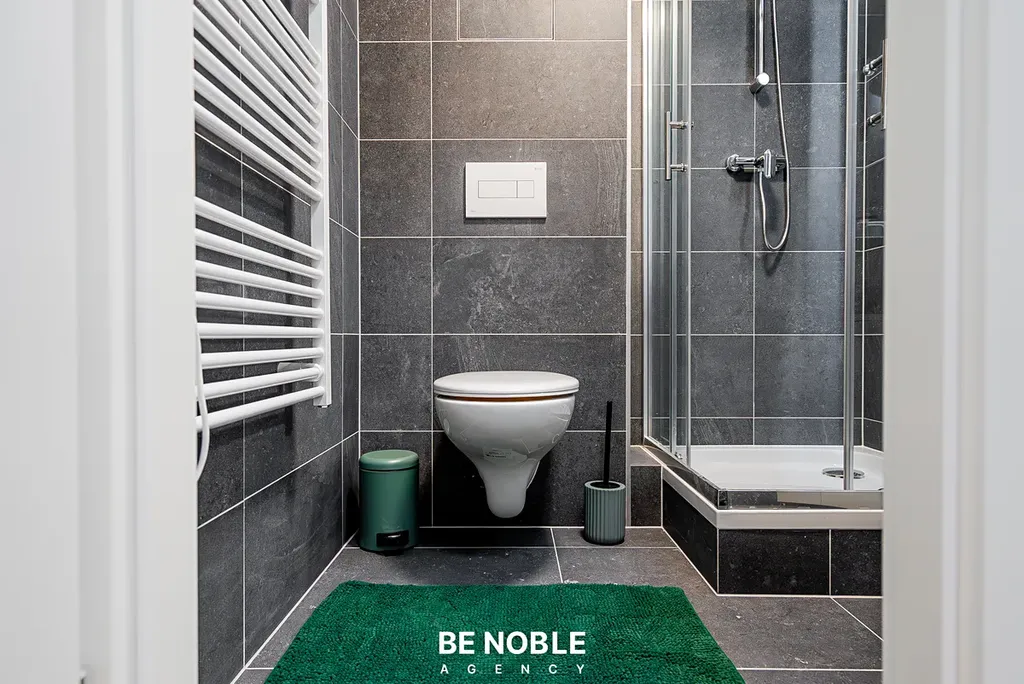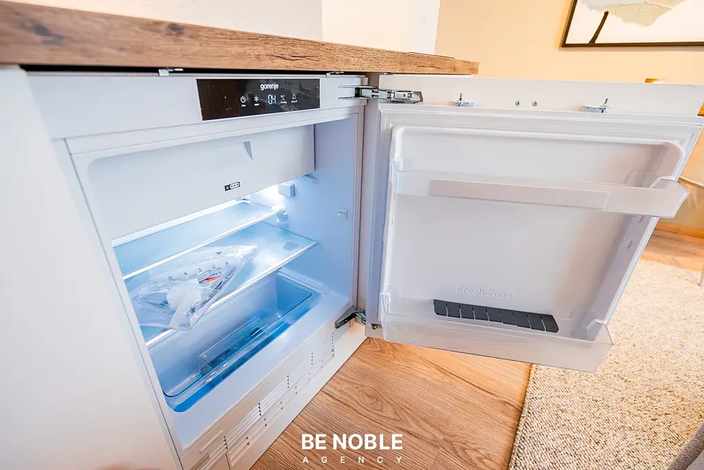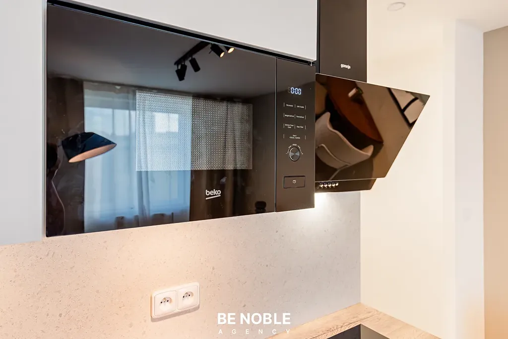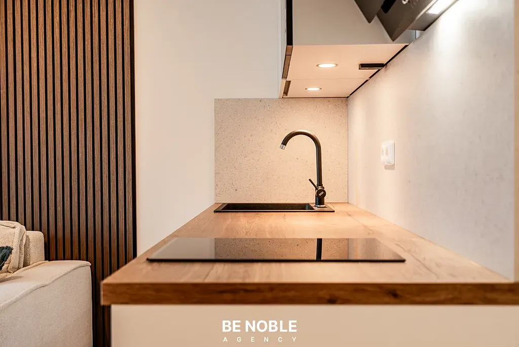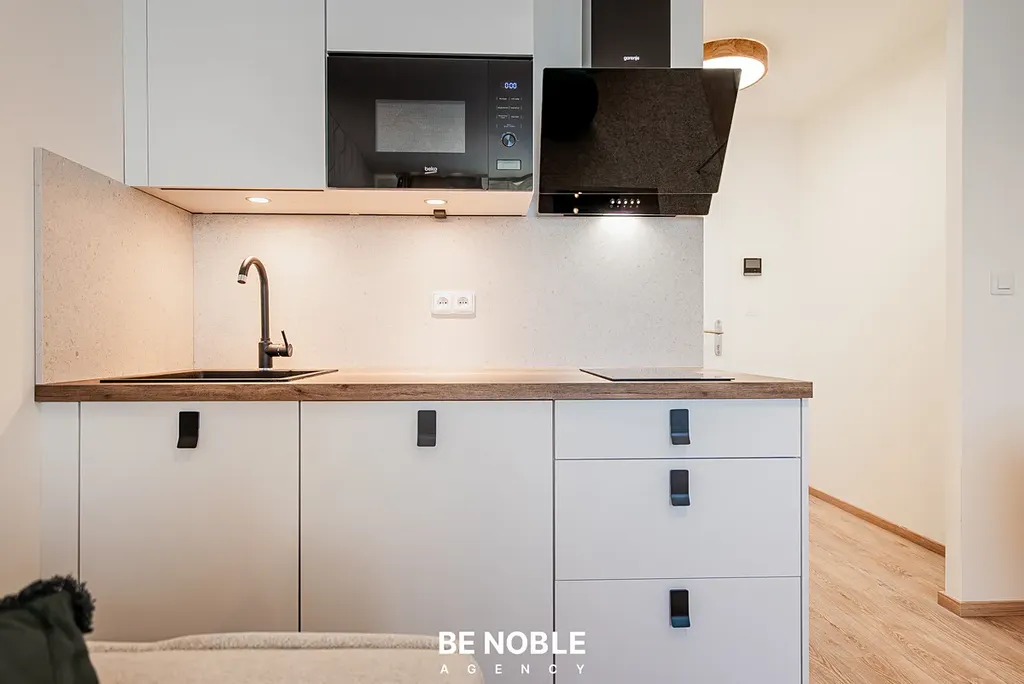 Byt byl navržen tak, aby dokonale využil každý centimetr prostoru a zároveň působil útulně i elegantně. Součástí je moderní kuchyňská linka s dostatkem úložných prostor, varnou deskou, lednicí, mikrovlnnou troubou a vestavěnou digestoří. Obytná část je vybavena kompletním nábytkem, dekorem a osvětlením od společnosti Bonami v celkové hodnotě přes 350 000 Kč – tedy nejen kuchyní, ale i pohovkou, komodou, stolem, závěsy, záclonami a designovými svítidly. Výsledkem je byt, který je připraven k okamžitému užívání nebo pronájmu – bez nutnosti dalších investic. Velké okno orientované do klidného vnitrobloku zajišťuje dostatek světla a příjemný výhled z 5. patra. V koupelně se nachází sprchový kout, toaleta a úložné prostory pod umyvadlem.