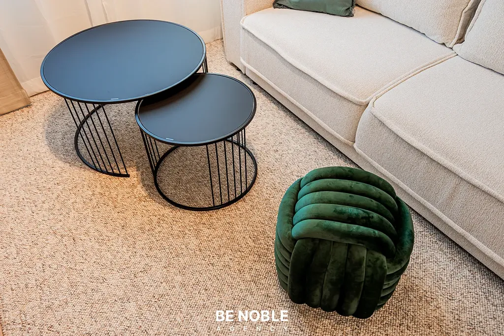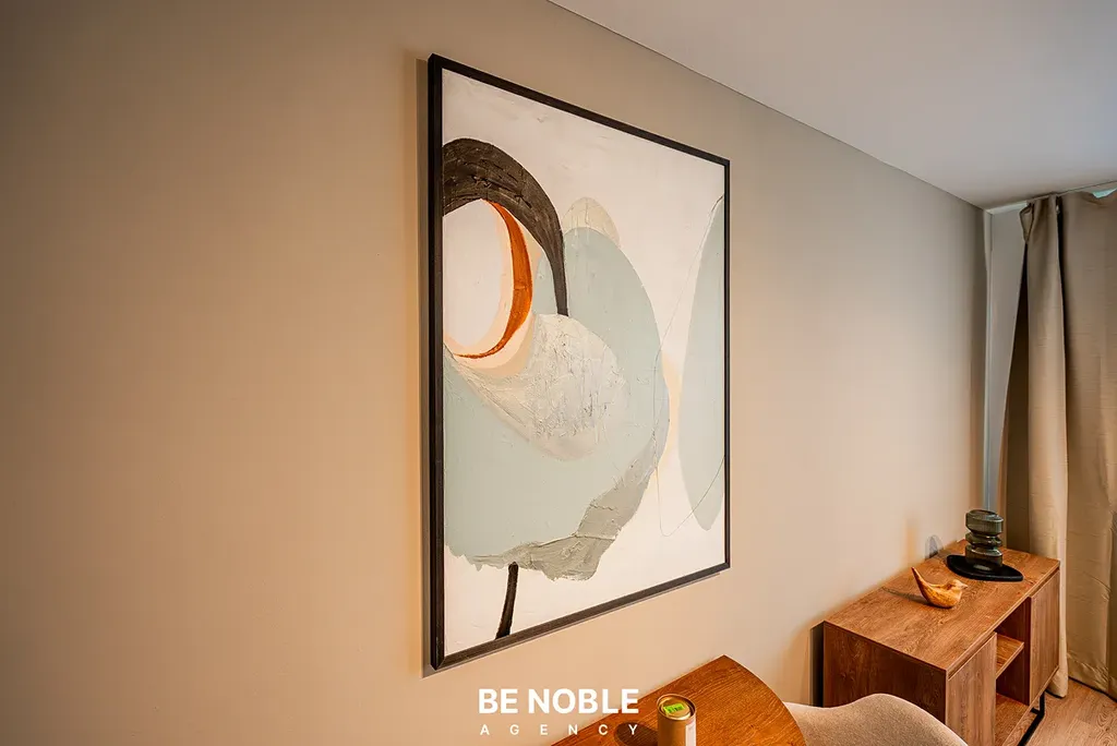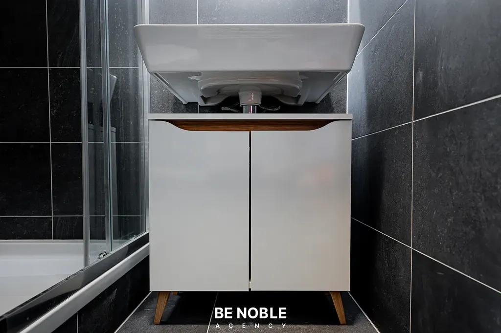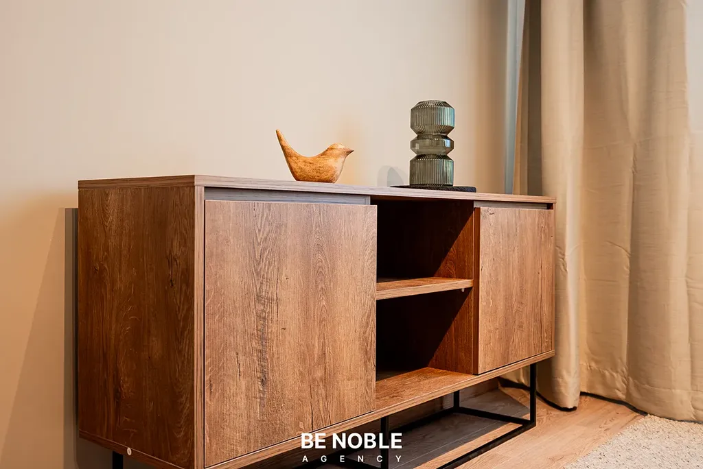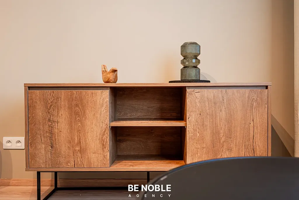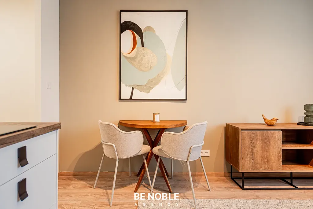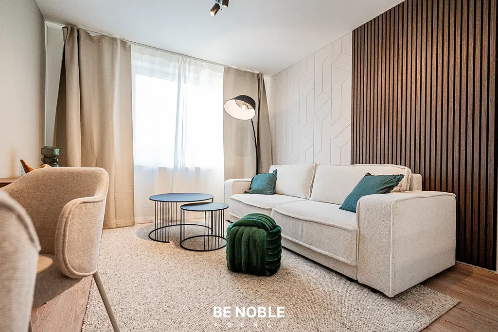 Byt byl navržen tak, aby dokonale využil každý centimetr prostoru a zároveň působil útulně i elegantně. Součástí je moderní kuchyňská linka s dostatkem úložných prostor, varnou deskou, lednicí, mikrovlnnou troubou a vestavěnou digestoří. Obytná část je vybavena kompletním nábytkem, dekorem a osvětlením od společnosti Bonami v celkové hodnotě přes 350 000 Kč – tedy nejen kuchyní, ale i pohovkou, komodou, stolem, závěsy, záclonami a designovými svítidly. Výsledkem je byt, který je připraven k okamžitému užívání nebo pronájmu – bez nutnosti dalších investic. Velké okno orientované do klidného vnitrobloku zajišťuje dostatek světla a příjemný výhled z 5. patra. V koupelně se nachází sprchový kout, toaleta a úložné prostory pod umyvadlem.