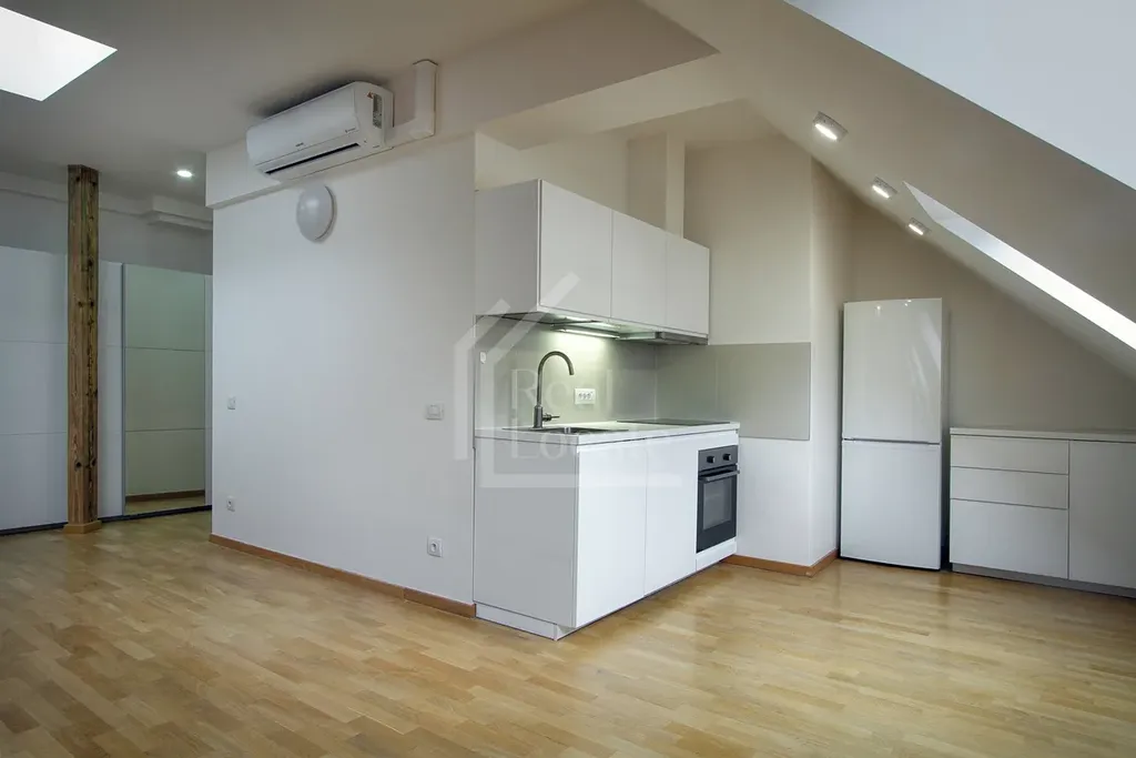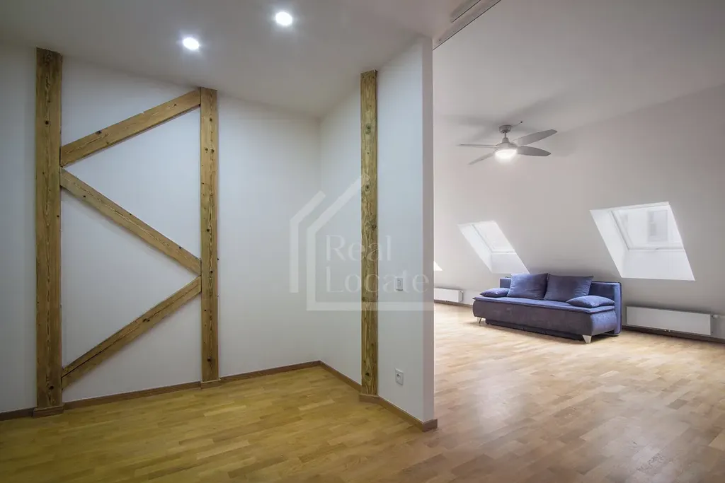 Jedná se o podkrovní byt o celkové rozloze 63m2 s orientací do vnitrobloku, což umožňuje dostatek klidu od ruchu velkoměsta. V bytě je dostatek denního světla. Vybavení bytu je velice vkusné a elegantní doplněné krásnými krovy. Byt je chytře oddělen na různé sekce - ložnice je přepážkou oddělená od obývacího pokoje a kuchyňského koutu. Koupelna je dostatečně velká s vanou.