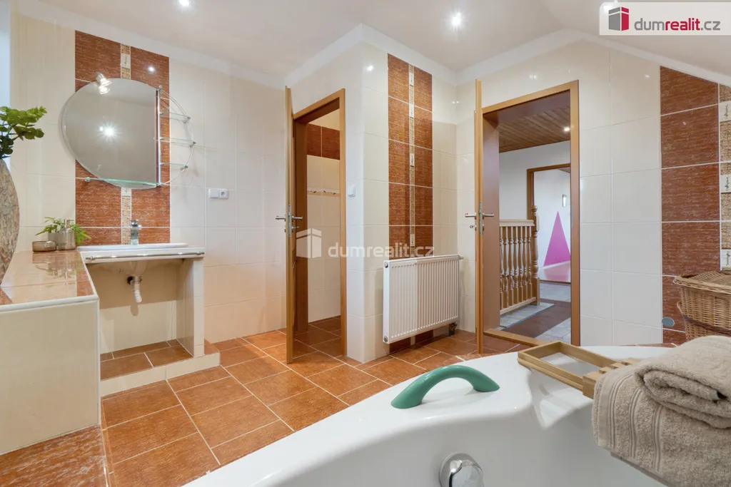 Podkroví: čtyři samostatné pokoje se šatnami a balkonem, koupelna, vstup na zateplenou půdu