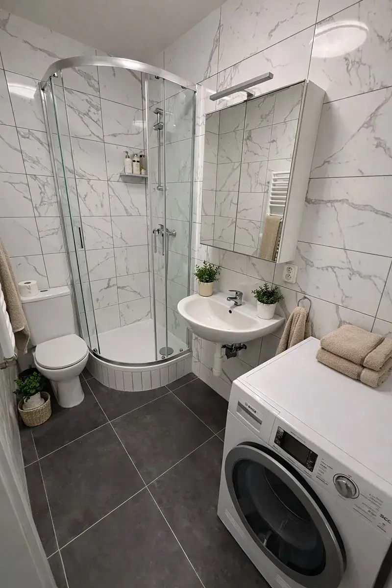 Koupelna disponuje sprchovým koutem, umyvadlem, toaletou s čerpadlem a pračkou. Vlastní plynový kotel zajišťuje vytápění i ohřev vody, což umožňuje regulovat náklady dle skutečné spotřeby.
