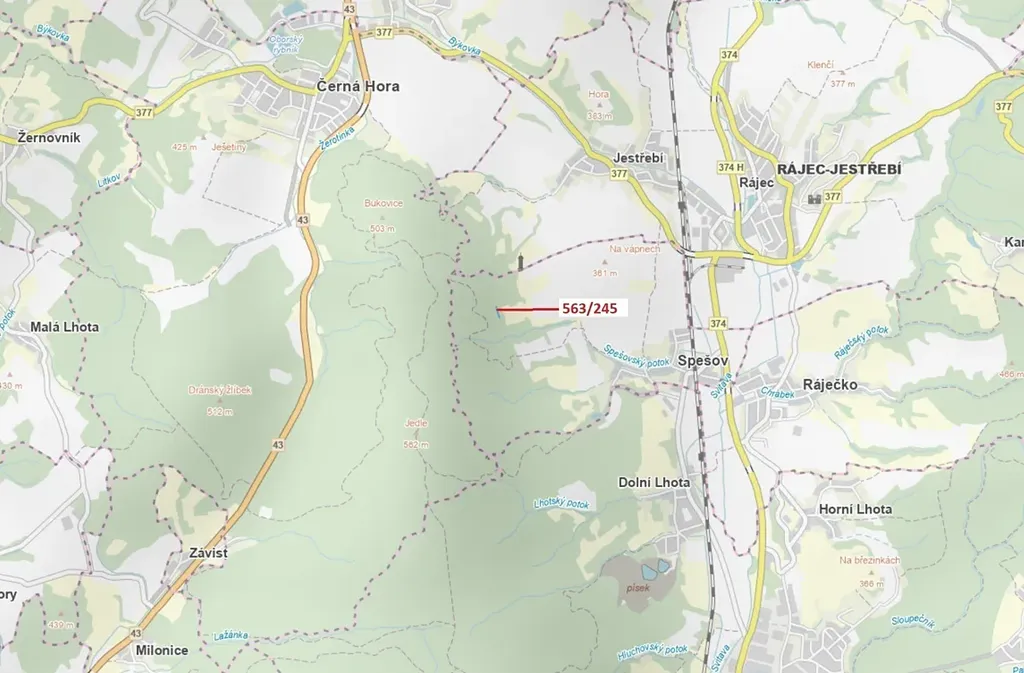 Lesní pozemek o výměře 1009 m2, parcelní číslo 563/245, podíl 1/1, katastrální území Spešov, obec Spešov, obec s rozšířenou působností Blansko, okres Blansko, Jihomoravský kraj.