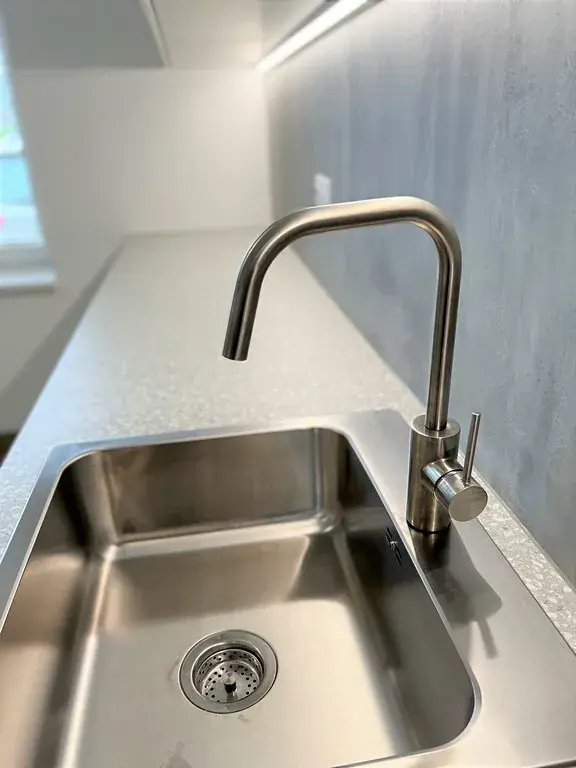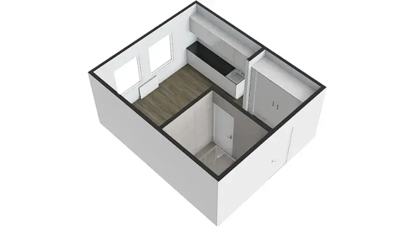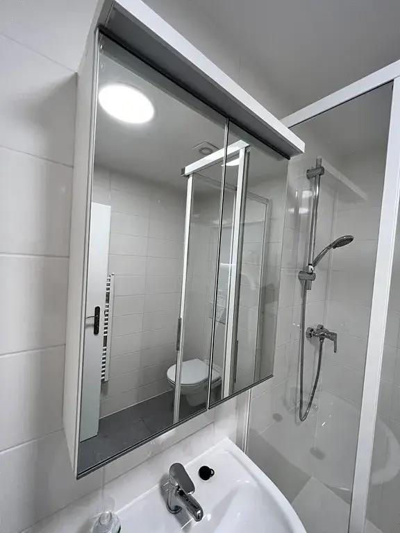 Za vstupními dveřmi bytu se nachází menší chodba (cca 3,20 m2), která disponuje prostornou šatní skříní. Po levé straně je koupelna se sprchovým koutem, závěsnou toaletou, umyvadlem, zrcadlovou skříňkou a otopným žebříkem. Koupelna má výměru cca 3,30 m2. Hlavní dominantou bytu je útulný obytný pokoj s kuchyňskou linkou o výměře cca 11,10 m2, který je orientovaný na východ. Kuchyňská linka je vybavena lednicí, dřezem a varnou dvou plotýnkou.