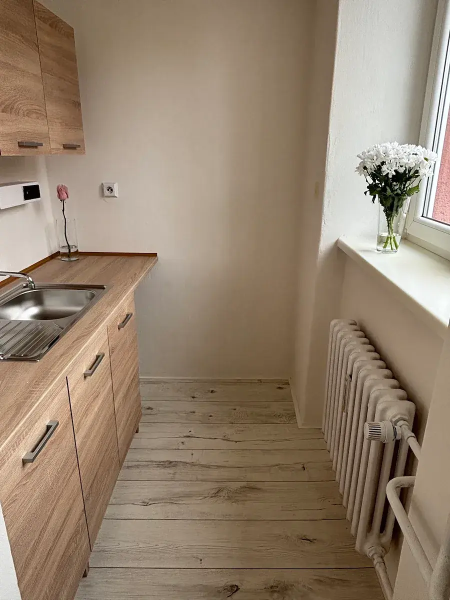 Pronájem bytu 1+kk na ulici Bruzovská ve Frýdku. Byt o výměře 25 m2 se nachází v prvním patře třípatrového zděného domu po částečných úpravách: má plastová okna, nový vchod a domovní rozvody vody a odpadů v plastu. V bytě je nová kuchyňská linka. Jádro je zděné, koupelna se sprchovací vaničkou je společná s toaletou. Místo pro pračku je v koupelně. Podlahy - lino. Ohřev vody a vytápění jsou dálkově.