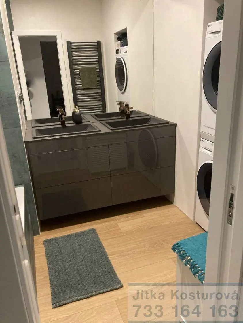 V bytě najdete moderně vybavenou kuchyňskou linku indukce, elektrická trouba, digestoř, myčka, mikrovlnka, lednice s mrazakem. Dále je zde rozkládací stůl + zidle. V obývacím pokoji si můžete odpočinout na pohodlné sedačce, anebo si přečíst knihu u okna ( koberec, stolky, komody, ). Na chodbě vestavěná skříň, v pokojích skříně a postel.V koupelně dominuje dvojumyvadlo, vana, pračka, sušička. Toaleta je zvlášť s vlastním umyvadlem.