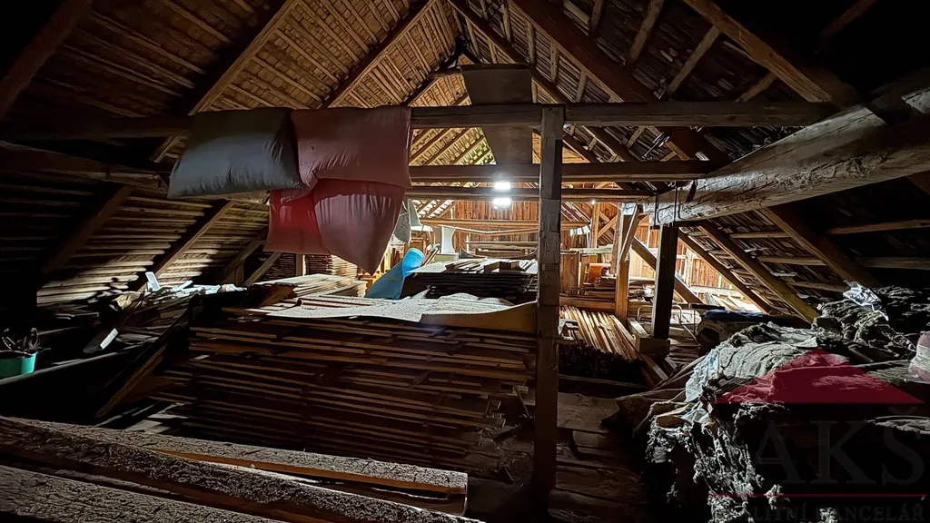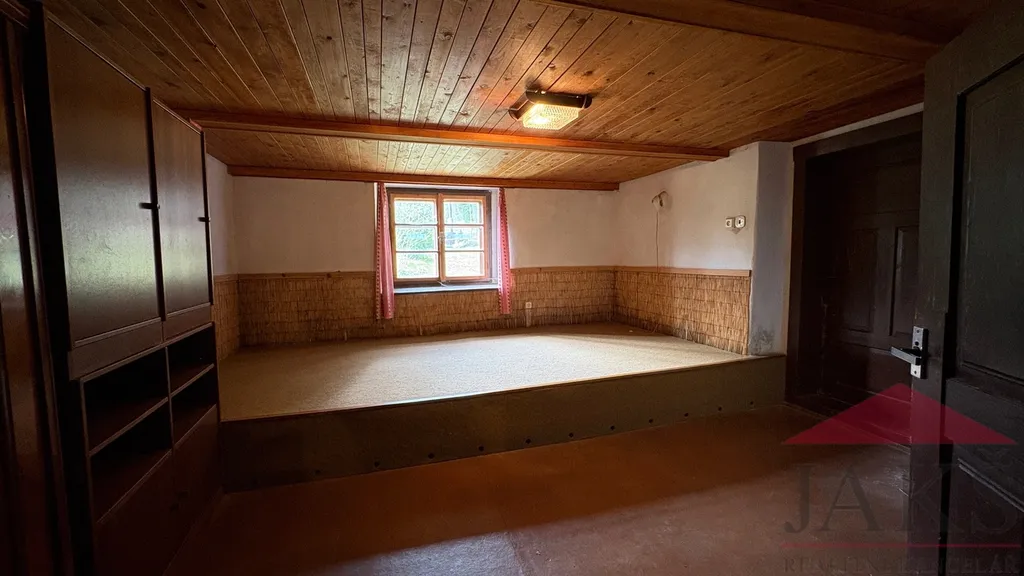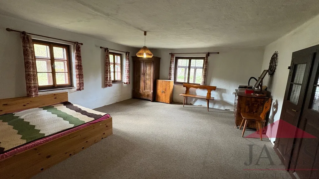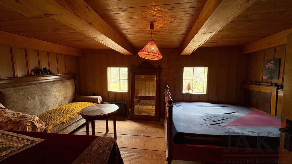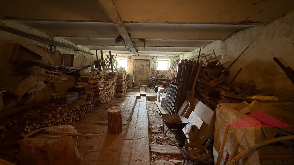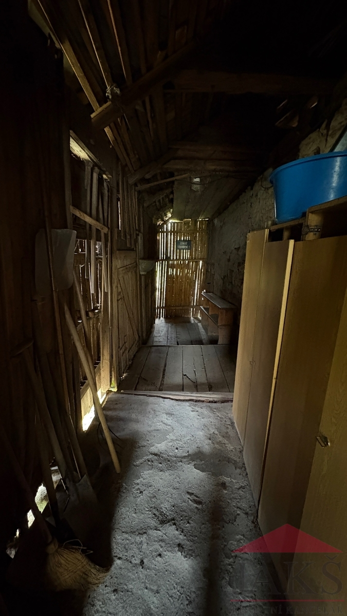 Popis: obytná část: přízemí: zastřešená vstupní veranda, suché WC, chodba (sprchový kout a el. boiler) s dřev. schodištěm do podkroví a sklepa, prostorná sednice (funkční kachlová pec s troubou, dřez, sporák na P.B., kredenc), 2x ložnice (kamna); podkroví: podesta, 2x ložnice; velká půda (vhodná k vestavbě); hospodářská část (vhodná k přestavbě na obytnou část): velký chlév (sklad), velká dřevěná stodola (sklad) s půdou.