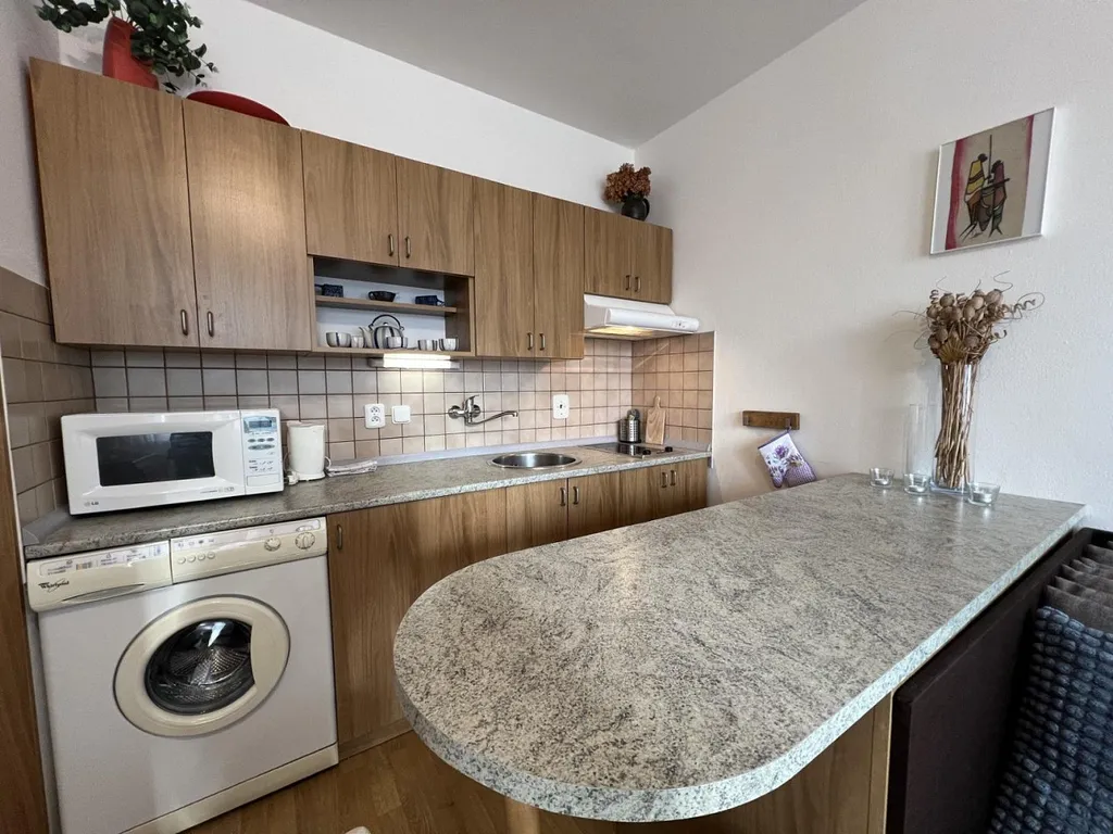 Byt je zařízený nábytkem a kuchyň je vybavena spotřebiči.