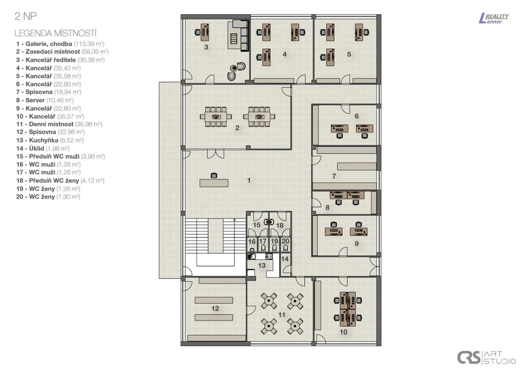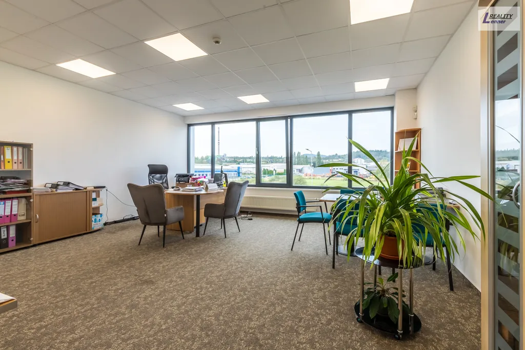 V první patře areálu se nachází cca 300 m2 kancelářských prostor a příslušenství: oddělení nákupu, oddělení kvality, vedoucí výroby, kancelářské místnosti, 3 archiv, zasedací místnost, serverovna, kuchyňka atd.