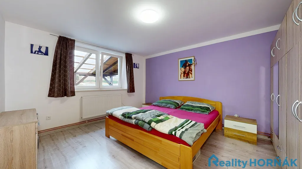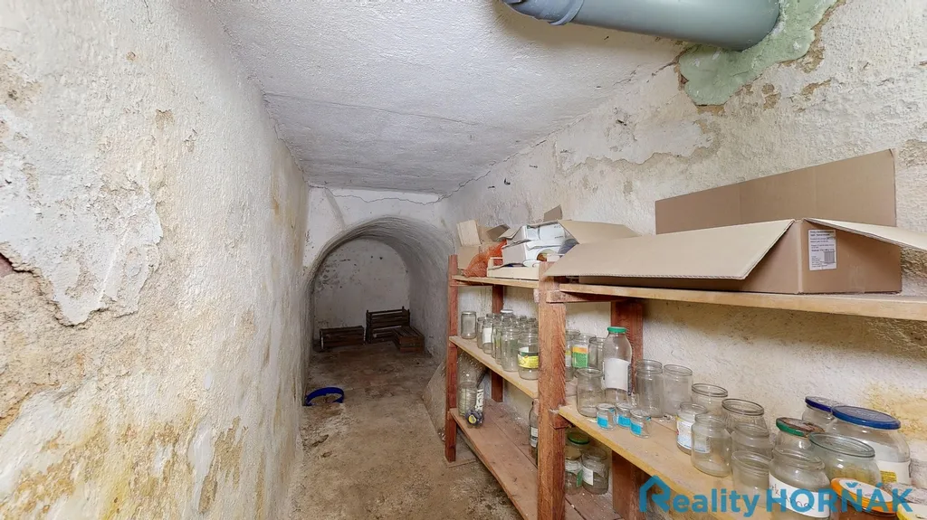 V současné době dům nabízí dispozici 5+KK, rozloženou do přízemí a obytného podkroví. V přízemí jsou situovány místnosti obývacího pokoje s kuchyňským koutem (6,40 x 5,03 = 32,2 m²), ložnice (5,05 x 4,37 = 22,1 m²), pokoj (3,56 x 3,74 = 13,3 m²), koupelna (2,37 x 2,07 = 4,9 m²), samostatné WC (1,52 x 1,52 = 2,3 m²). Dispozici přízemí doplňují místnosti vstupní chodby (3,74 x 2,55 = cca 9,5 m²), navazující komunikační část chodby (3,69 x 1,42 = cca 5,2 m²) a komora (1,33 x 1,44 = 1,9 m²). Po pohodlném schodišti vystoupáme do podkroví se komunikační chodbičkou (3,69 x 2,42 = cca 8,9 m²) a dvěma pokoji (3,69 x 4,63 = 17,1 m² a 3,69 x 4,54 = 16,8 m²). V mezipatře je vybudováno samostatné WC (1,42 x 1,46 = cca 2,1 m²). Dispozici podkroví lze případně dále rozvíjet do dosud nevyužitého půdního prostoru (3,69 x 6,74 = cca 24,9 m²). Rodinný dům dále nabízí dvě sklepní místnosti (8,30 x 1,54 = 15,4 m² a 2,30 x 5,12 = 12,6 m²). Potravinový sklep je přístupný z chodby, technický sklep ze dvora. Uvedené výměry místností vycházejí z dostupných půdorysných podkladů a z měření v rámci 3D skenu nemovitosti. Jedná se o orientační údaje sloužící pro základní přehled o dispozici; přesné výměry se mohou v drobných odchylkách lišit. Obvodovou konstrukci domu tvoří smíšené, převážně cihelné zdivo. Okenní otvory jsou osazeny plastovými okny s izolačním dvojsklem. Fasáda není zateplena. Dům kryje nová střešní krytina, položená na původním krovu. Obytné místnosti podkroví jsou zatepleny skelnou vatou. V přízemí jsou převážně betonové podlahy, kryté linem, v části jsou původní dřevěné podlahy překryté OSB deskami a opět linem. V podkroví jsou betonové podlahy, kryté linem, anebo keramickou dlažbou. V rámci modernizace domu byly provedeny nové rozvody elektřiny (měděné vodiče). Rozvody vody a odpadů jsou nové, provedené v plastu. Vodou je dům zásobován z vlastní kopané studny o hloubce cca 8–9 m. Odpady jsou svedeny do septiku s následným trativodem do pole. Vytápění je řešeno teplovodním ústředním systémem (radiátory) napojeným na tepelné čerpadlo vzduch–voda. Ohřev teplé vody zajišťuje elektrický bojler.
