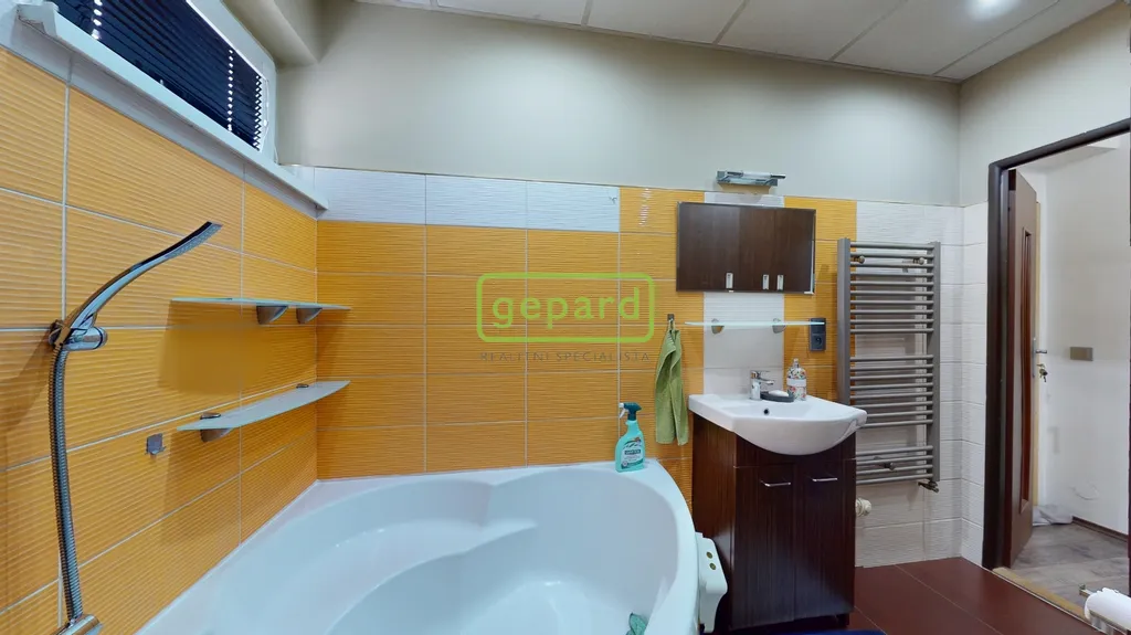 Koupelna s rohovou vanou, umyvadlem a WC. V celém bytě jsou položeny plovoucí podlahy, které spolu s interiérovými dveřmi a obložky vytváří velice příjemný pocit z celého prostoru.