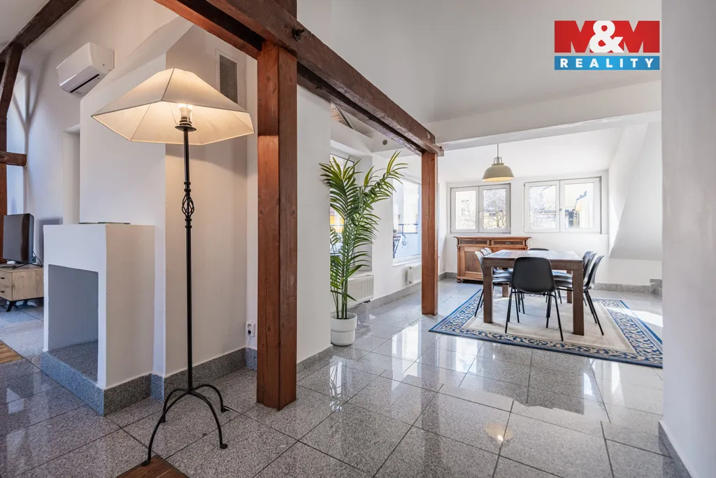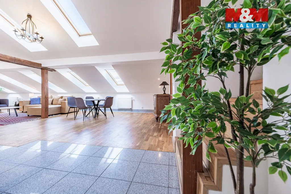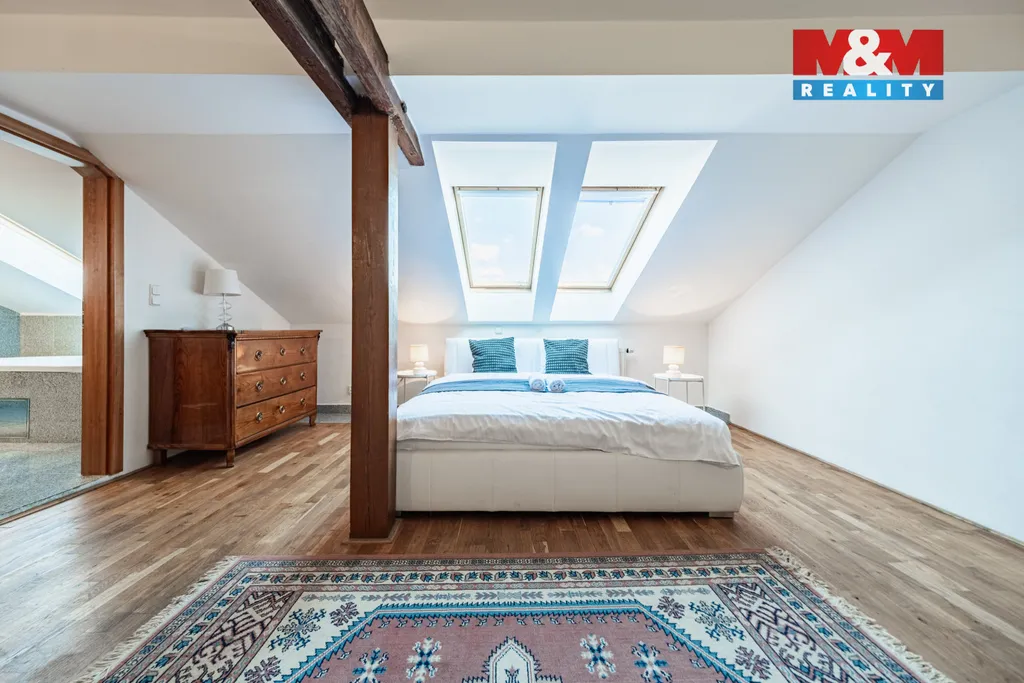Chcete diamant v srdci Prahy? Představujeme Vám prostorný atypický podkrovní mezonetový byt o užitné ploše celkem 300 m² v samém srdci metropole. Tento skvost naleznete v ul. Řeznická. Byt je složený ze dvou bytů 6+1 a 3+kk s vlastními vchody v cihlovém domě v 5 N.P. Otevřený interiér je vybaven starožitným nábytkem a dominantními dřevěnými rámy, které celému bytu dodávají útulný nádech. Kuchyně ve vysokém lesku je osazena moderními spotřebiči, která je propojená s jídelnou a obývacím pokojem. Z jídelny je velkými okny krásný výhled na terasu. Celkem jednotka disponuje 2 terasami s výhledem do dvora, 6 ložnicemi, z toho 3 se nachází v mezonetu. Dále zde najdete 4 koupelny, kde jsou sprchové kouty nebo vana. Krásné 2 krby pro velmi příjemnou atmosféru a teplo domova. Obě bytové jednotky disponují klimatizací. Vytápění je zařízeno plynovým závěsným kotlem Junkers. Výborná pěší dostupnost do centra. Veškerá občanská vybavenost je v blízkém okolí bytu. Prohlídkový den bude 10.03.2026.