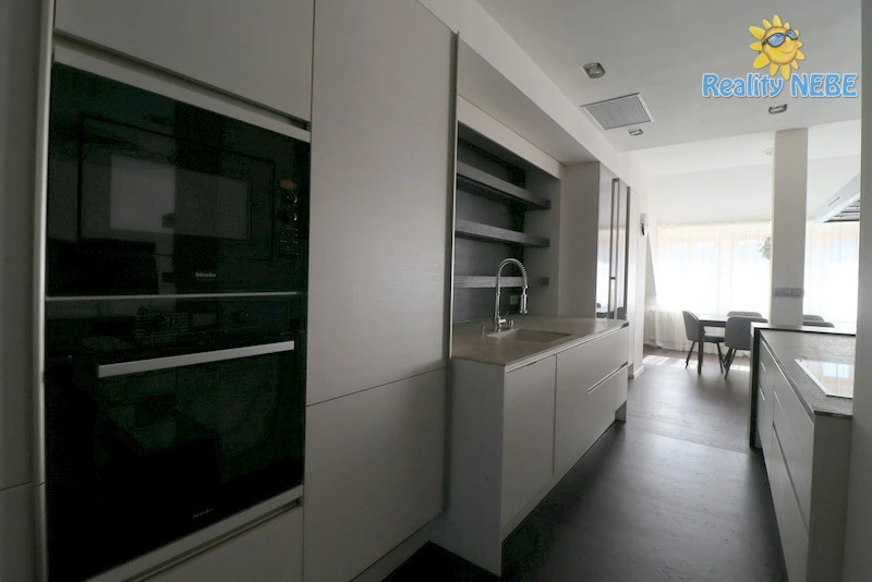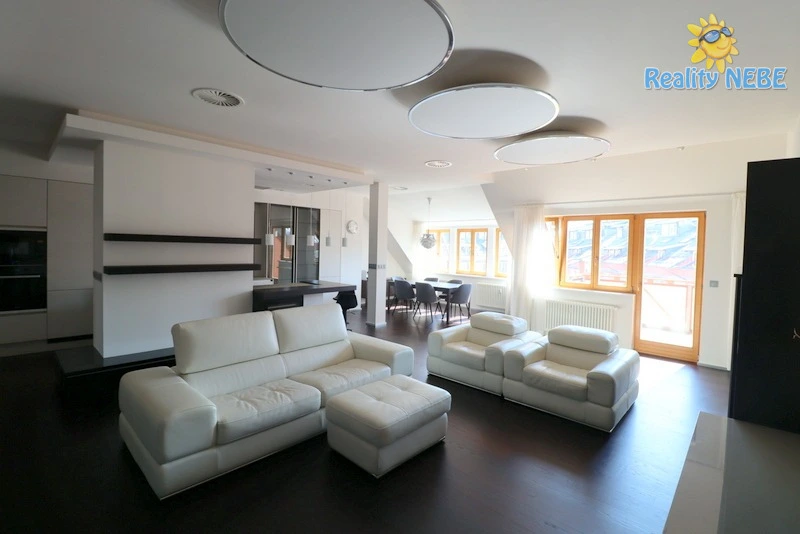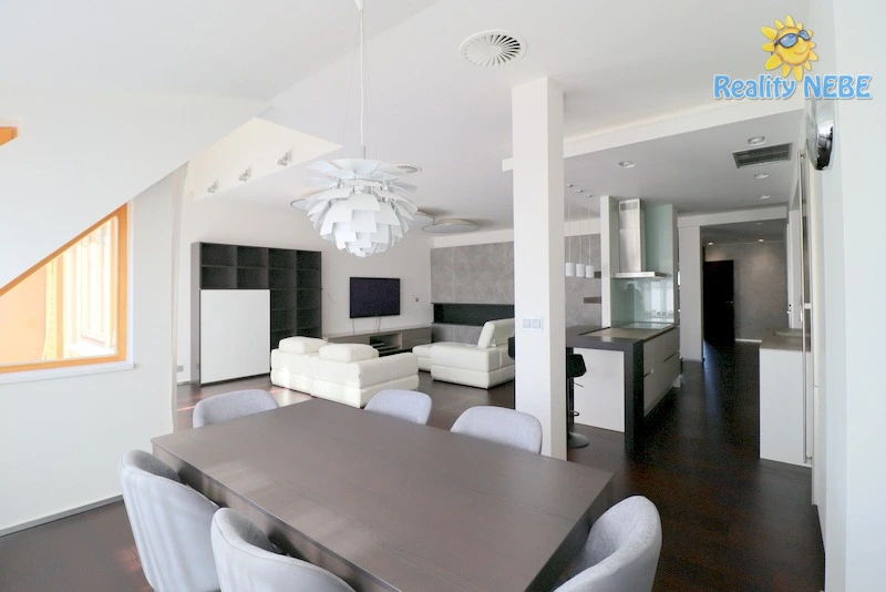Srdcem bytu je velmi prostorný obývací pokoj spojený s jídelním koutem a velkou kuchyní s dvěma linkami. Obývací pokoj je plně zařízený, součástí je TV, sedací souprava, jídelní stůl, židle i barové stoličky. Všechny spotřebiče v kuchyni stejně jako vestavěná pračka a sušička jsou značky Miele.