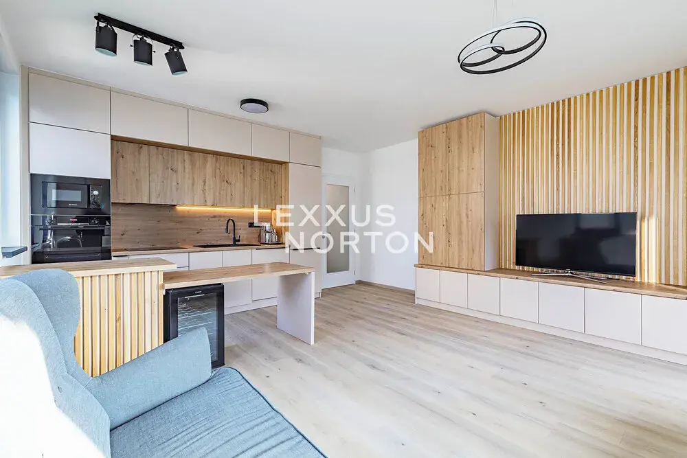 Byt se nabízí jako částečně zařízený. Kuchyňský kout je vybaven lednicí s mrazákem, myčkou nádobí, troubou, varnou indukční deskou, mikrovlnnou troubou a kávovarem. Okna jsou opatřena venkovními roletami. Koupelna disponuje vanou se sprchovým systémem, pračkou a sušičkou LG. Součástí vybavení je také lednice na víno a klimatizace. Podlahy tvoří kombinace vinylu a dlažby.