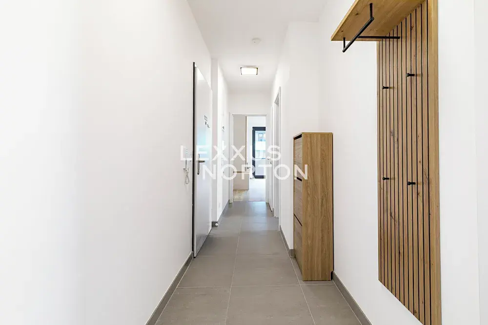 Byt dispozičně nabízí vstupní chodbu, prostorný obývací pokoj s kuchyňským koutem a přímým vstupem na balkon, dvě samostatné ložnice, koupelnu a oddělenou toaletu. K bytu náleží garážové stání a sklep. Využít lze také společnou kočárkárnu/kolárnu.