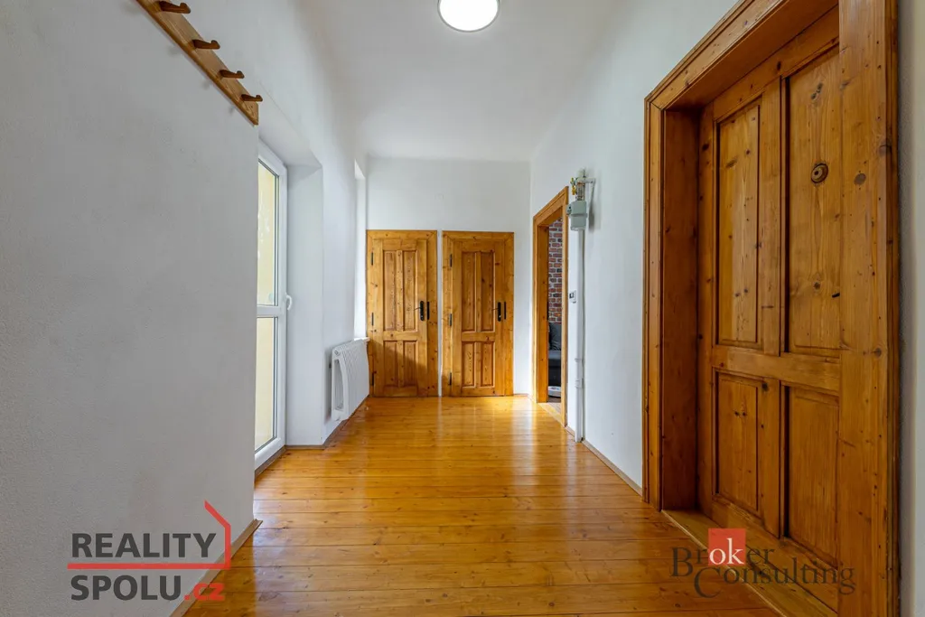 • Dřevěné prvky: dřevěná podlaha v chodbě, dřevěné interiérové dveře, příjemné detaily (dřevo/cihla)