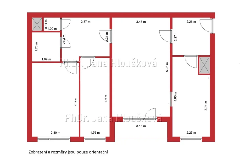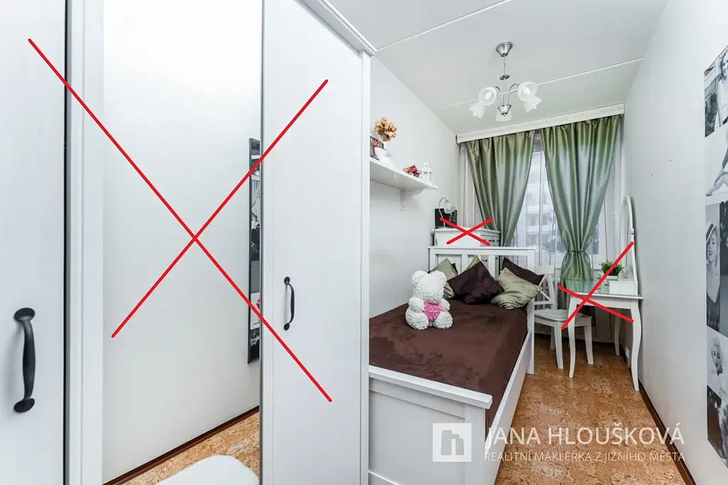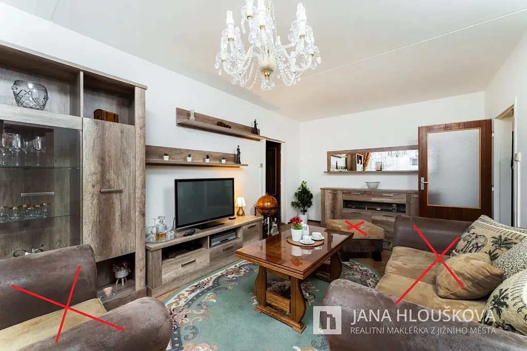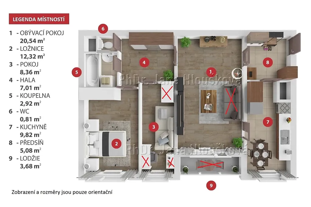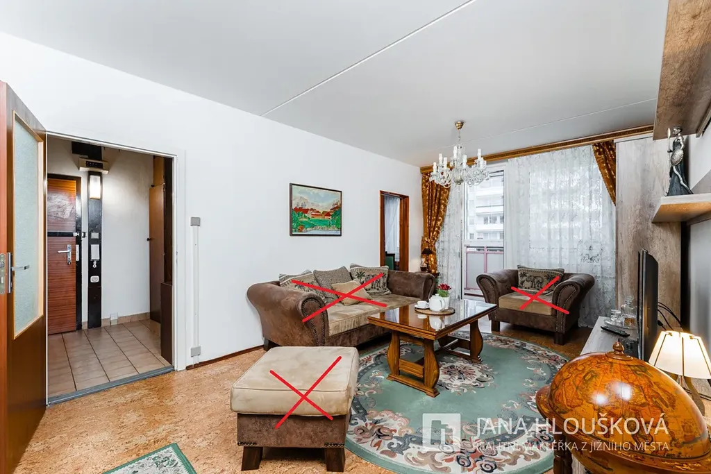 Dispoziční uspořádání bytu je patrné z přiloženého kótovaného 2D půdorysu a možné rozložení nábytku je vidět na přiloženém 3D půdorysu. Byt je částečně vybaven, viz. foto (přeškrtnuté vybavení v bytě není).