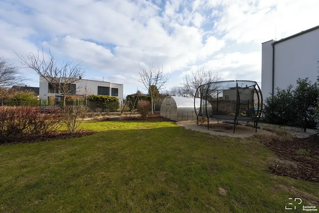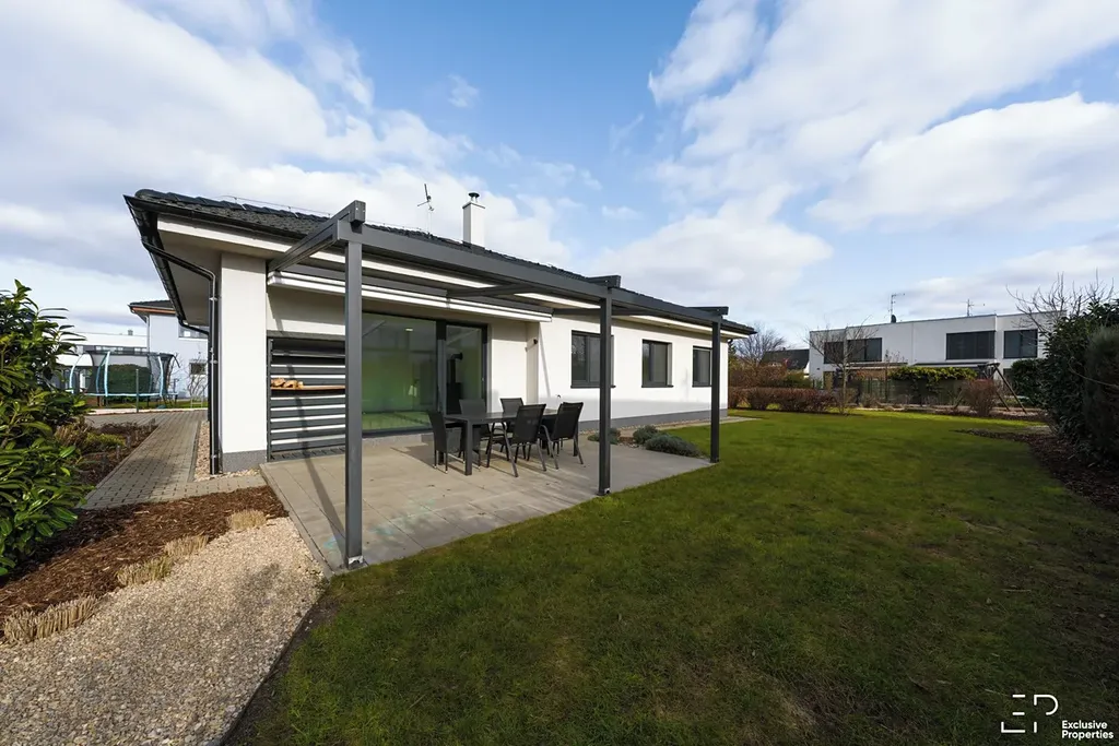 Výměra pozemku je 1056 m2. Podlahová plocha domu je 119 m2. Dispozice 5+kk. Orientace pobytové části zahrady JZ, Z. Prostorná terasa s posuvným zastřešením a zahradním nábytkem. Založená a udržovaná zahrada s automatickou závlahou, skleníkem a trampolínou. Případně po dohodě k využití nadzemní bazén.
