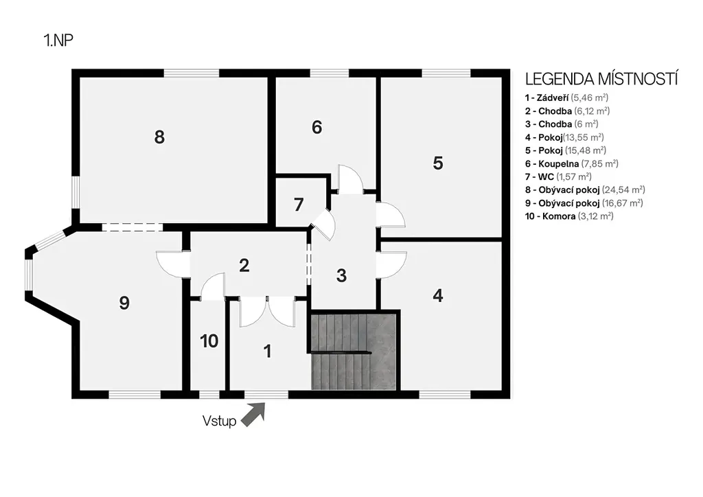 Dispozice domu je 7+kk. V přízemí se nachází chodba s vestavěnými skříněmi a prostornou komorou, v levém křídle domu je obytná místnost s kuchyní, jídelním arkýřem a pokojem s krbem, odkud se dá vyjít francouzskými dveřmi do zimní zahrady, v pravém křídle přízemí je koupelna se sprchovým koutem, samostatná wc a 2 pokoje vhodné na pracovnu nebo ložnici.V 1.patře se nachází 4 pokoje s dostatkem vestavěných skříní, 2 ložnice mají přístup na západně orientovanou terasu, prostorná koupelna s jacuzzi vanou a samostatná toaleta.