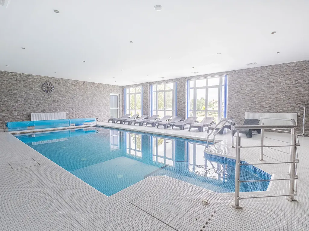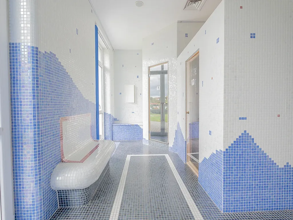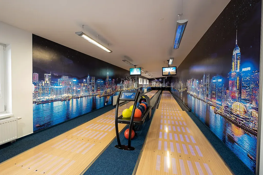 V přízemí budovy se nachází obytná část se vstupem na terasu, kuchyň, technické zázemí domu, a dále relaxační zóna - vnitřní bazén, fitness, infrasauna a parní lázeň, bowlingová místnost.