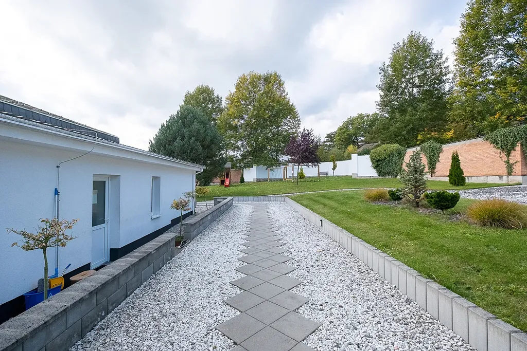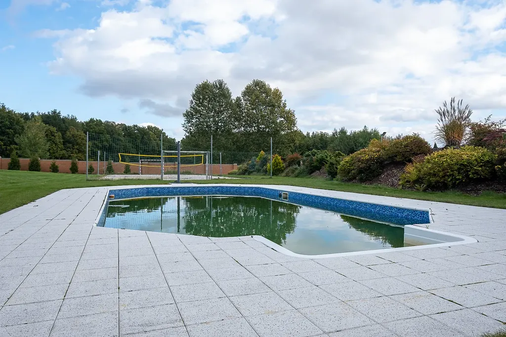 Členitá zahrada nabízí k dispozici venkovní bazén, minigolf, beachvolejbalové hřiště a tenisový kurt, dva zděné přízemní domky a dřevěnou zastřešenou pergolu s letní kuchyní.