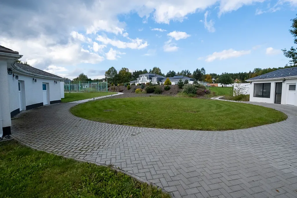 Jedná se o dvoupodlažní jižně orientovanou budovu s velkorysým vnitřním i venkovním zázemím. Rezidenční část o výměře 9.740 m2 je obezděna a celý komplex zaručuje svým majitelům dokonalé soukromí.