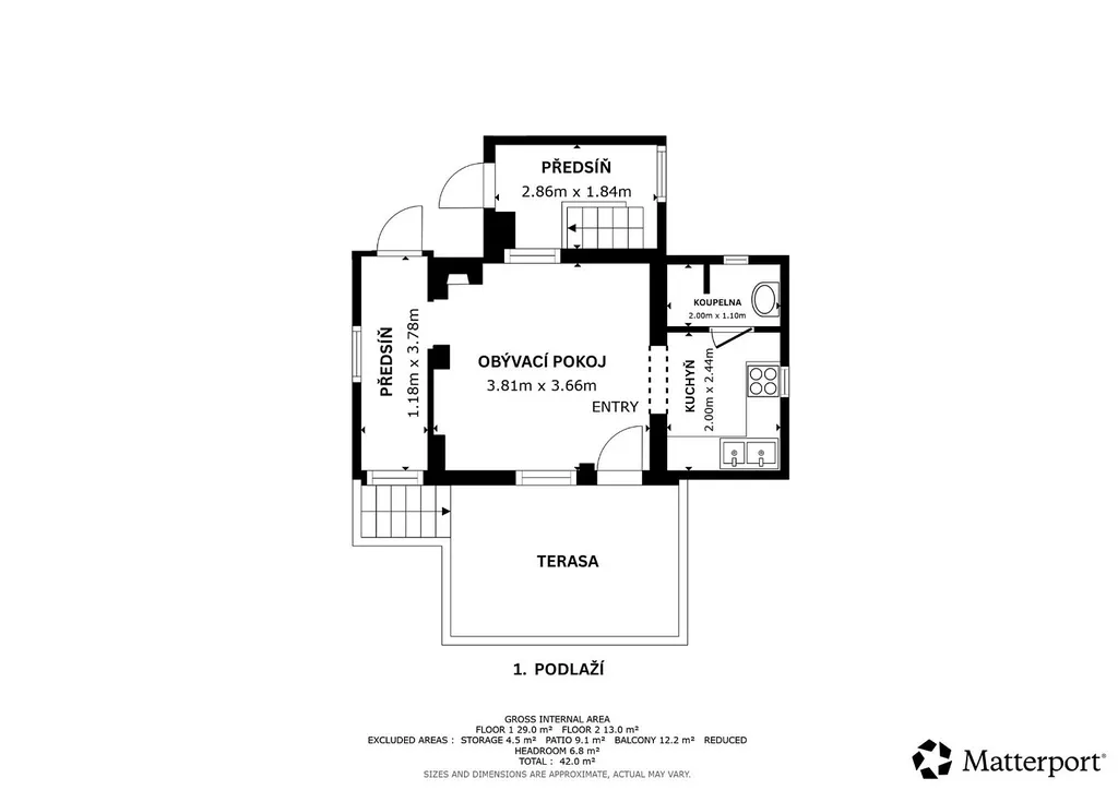 V 1. nadzemním podlaží se nachází menší obývací pokoj s krbem a vstupem na terasu, předsíň, kuchyně a menší koupelna. V podkroví je meší ložnice a místo pro uskladnění věcí.