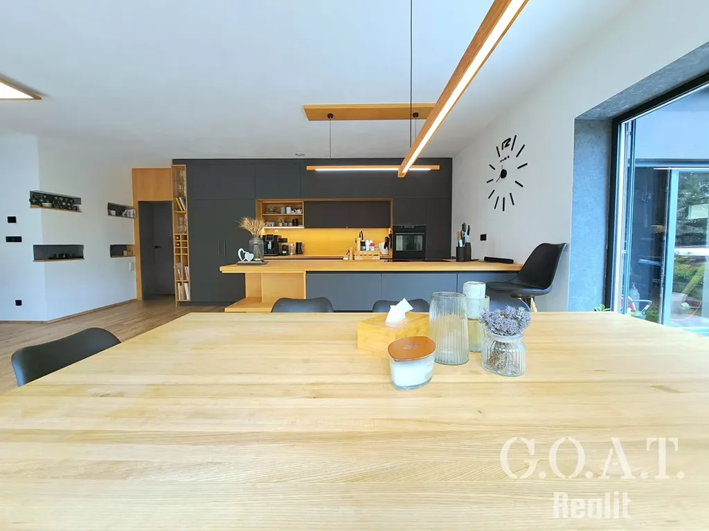 Dispozice 3kk: Dům nabízí prostorný obývací pokoj s kuchyňskou linkou dělanou na zakázku, která poskytuje dostatek prostoru pro vaření i společné chvíle s rodinou.