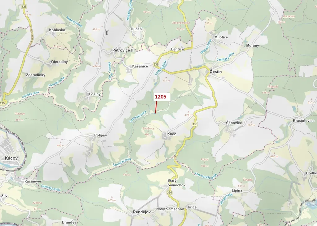 Lesní pozemek o výměře 518 m2, parcelní číslo 1205, podíl 1/1, katastrální území Kněž u Čestína, obec Čestín, obec s rozšířenou působností Kutná Hora, okres Kutná Hora, Středočeský kraj.