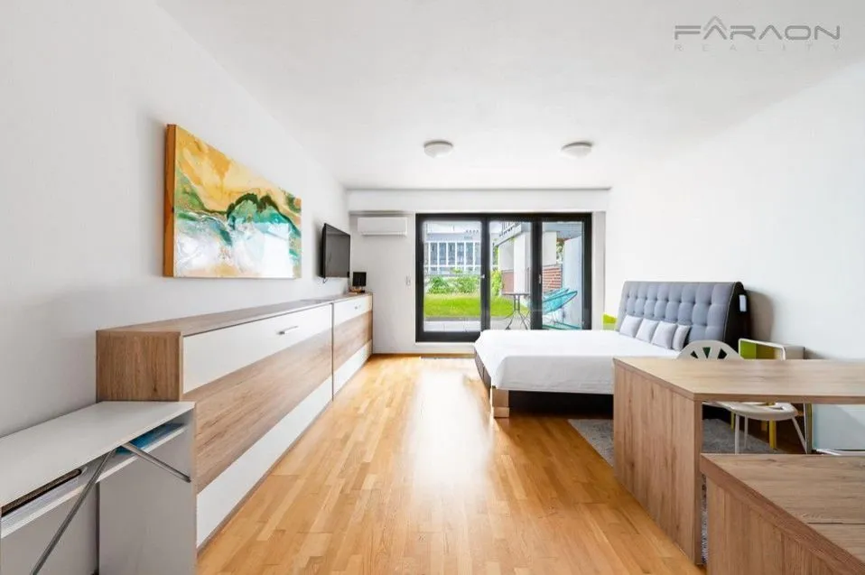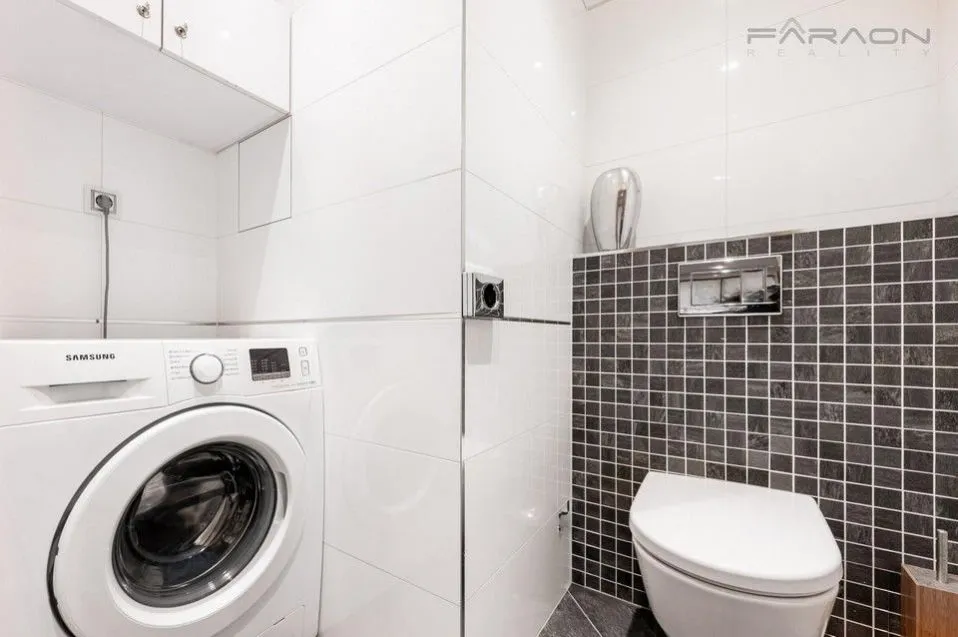 Dispozici bytu 1+kk bytu tvoří otevřený prostor obývací části s jídelním prostorem a kuchyní v bílém lesklém designu v kombinaci s dřevem, s působivými prosklenými francouzskými okny a výhledy na panorama Prahy, dále prostorná koupelna se sprchovým koutem, samostatná závěsná toaleta zvlášť, vstupní hala se zabudovanými šatními skříněmi. Veškerý nábytek je dělaný na míru, v ložnici je značková prostorná postel z masivu s kvalitní matrací. Dostatek úložných prostor je i ve sklepě, kde je na míru vybudovaný policový systém. k dispozici vymezené parkovací místo u domu 800 000,-