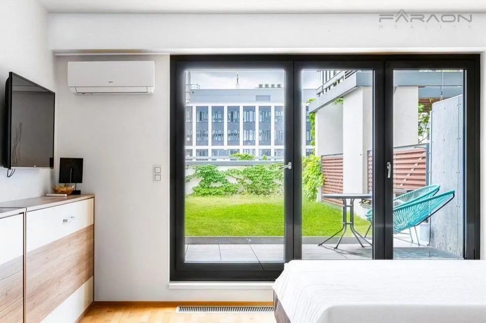 REZERVACE. Prodej moderního, kompletně vybaveného bytu 1+kk (37,4m2 + 9,4m2 terasa a s unikátní zahradou 49,3m2 ) a velkým sklepem (v ceně nájmu) v 6.podlaží domu v novostavbě bytového projektu Garden Tower s recepcí, ostrahou, v atraktivní části Prahy - na rozhraní Vinohrad a Žižkova se snadnou dostupností do centra Prahy. 8 minut tramvají od Václavského náměstí. Zastávka tramvají je přímo před domem. V minutové docházkové vzdálenosti stanice metra A Želivského a Flora.