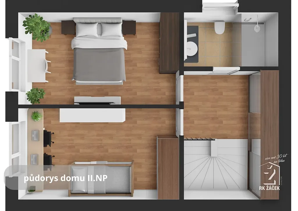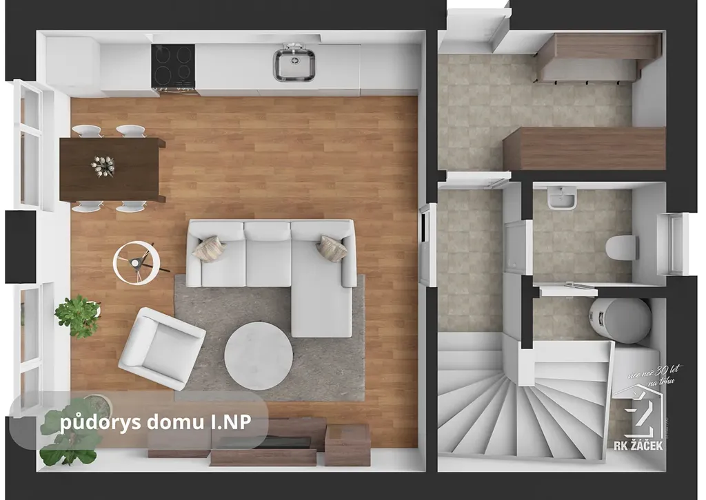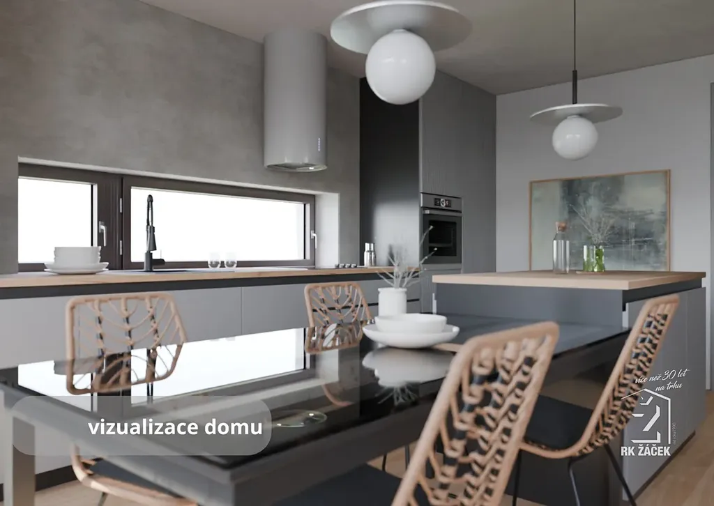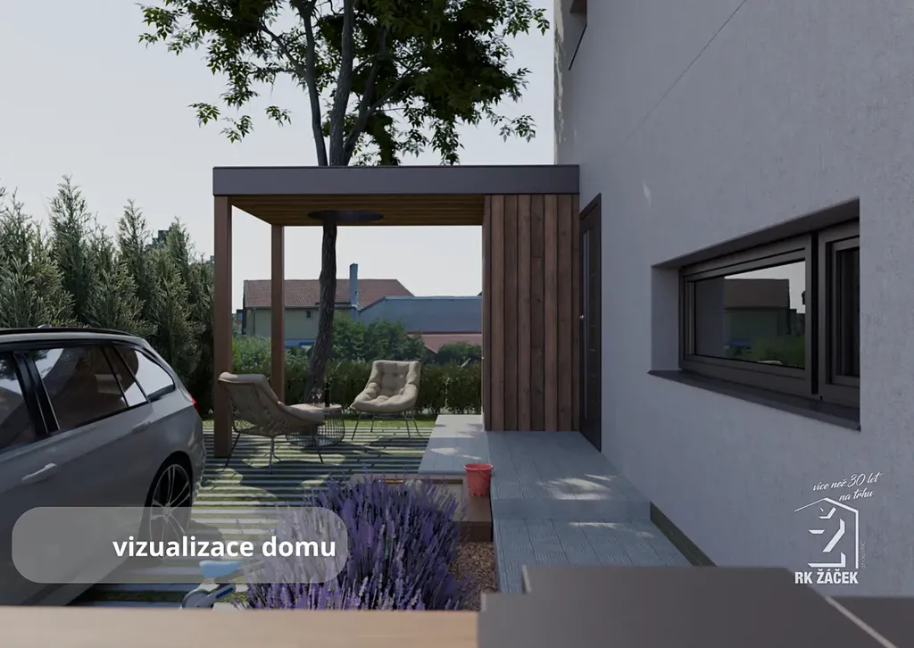 Součástí prodeje je projekt moderního rodinného domu o dispozici 3+kk a platné stavební povolení, takže můžete začít stavět bez zdlouhavého vyřizování. Navržený dům má zastavěnou plochu 62,2 m² a užitnou plochu 94,5 m². V přízemí se počítá s obývacím pokojem s kuchyňským koutem, zádveřím, technickým zázemím a samostatným WC, v patře pak se dvěma pokoji a koupelnou. Projekt myslí i na praktické detaily, jako je úložný prostor a parkování přímo na pozemku.