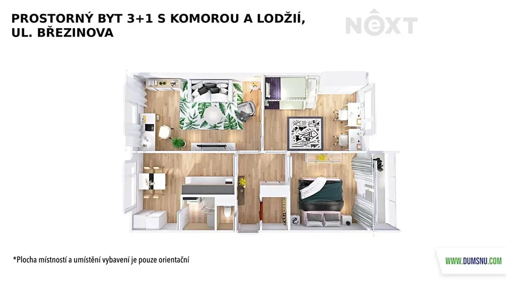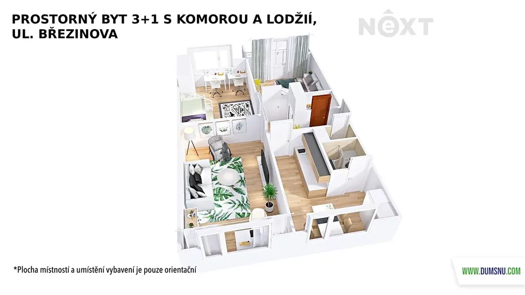 Dispozice bytu je velmi praktická – ze vstupní chodby je přístup do všech místností. Kuchyně je vybavena kuchyňskou linkou s kombinovaným plynovým sporákem. Koupelna nabízí sprchový kout, umyvadlovou skříňku se zrcadlem a prostor pro pračku i sušičku. WC je zvlášť. Byt prošel částečnou rekonstrukcí a má zděné jádro. Součástí je také komora přímo v bytě, která poskytuje další úložný prostor. K bytu náleží lodžie, která bude v rámci plánované revitalizace zvětšena a zasklena.