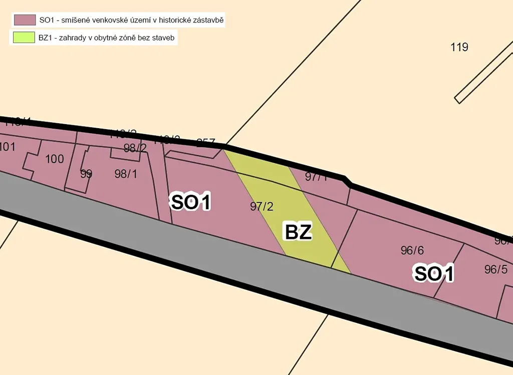 Pozemek o výměře 2.169 m² je vhodný dle územního plánu pro stavbu rodinného domu v západní části pozemku. Zastavěnost pozemku je 35 %.