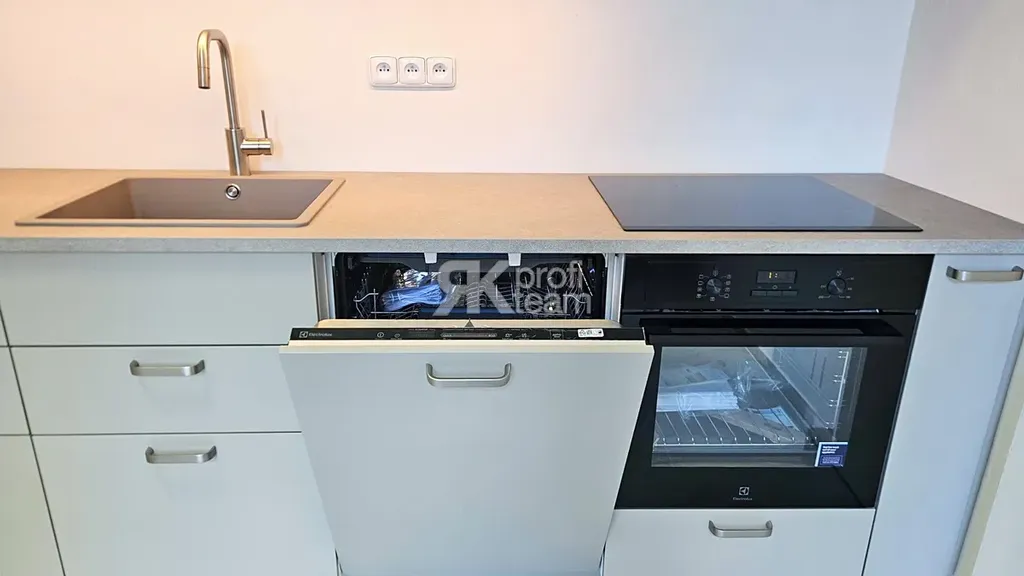 Kuchyně je vybavena kuchyňskou linkou se zabudovanou varnou deskou, troubou a myčkou nádobí. Lednice je ve spíži.