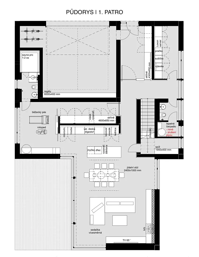 Přízemí domu tvoří velkorysý obytný prostor o výměře 109 m², který přirozeně propojuje obývací pokoj, jídelnu a kuchyň. Na tuto část plynule navazuje samostatná posilovna a relaxační zóna se saunou, citlivě oddělená pro zachování soukromí. Dále se zde nachází samostatná toaleta, praktická spíž, technická místnost a prostorná vstupní hala s přímým vstupem z garáže i z exteriéru.