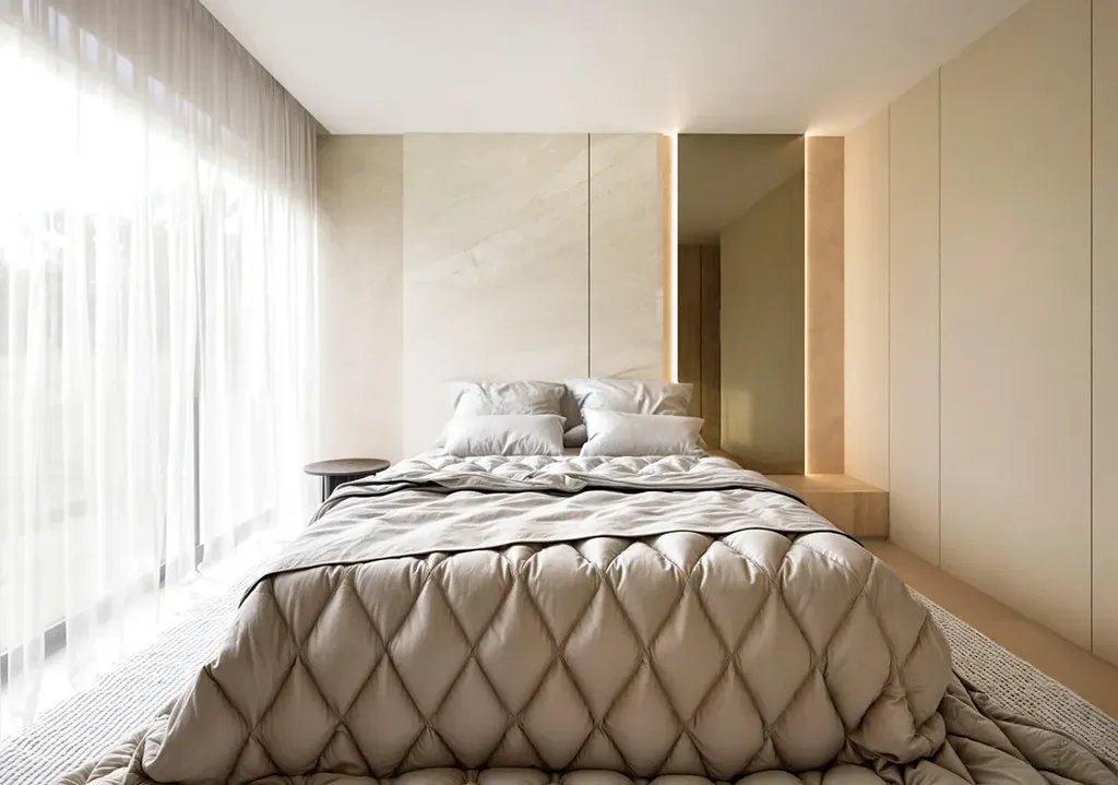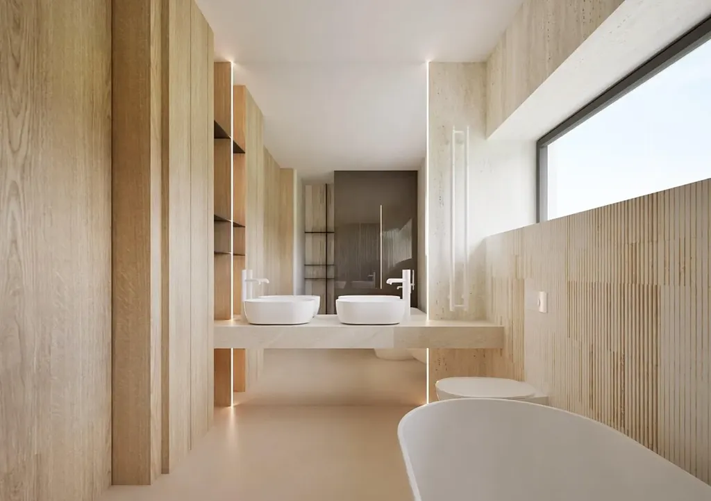 Na obytnou část navazuje privátní wellness a fitness zóna se saunou, navržená jako klidové místo pro regeneraci a každodenní rovnováhu.