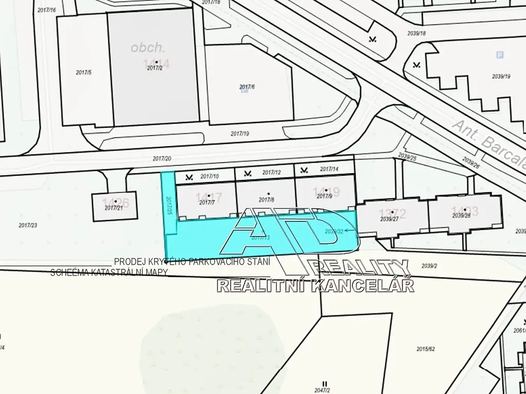 Objekt garáží Ant. Barcala čp. 1417/1 má vlastní samostatný vjezd z ulice Ant. Barcala, uzavřený sekčními vraty na dálkové ovládání. Prodej podílu ve výši 1/48 na objektu garáží, užívací právo ke konkrétnímu parkovacímu místu je pak na základě dohody spoluvlastníků a stanov sdružení.