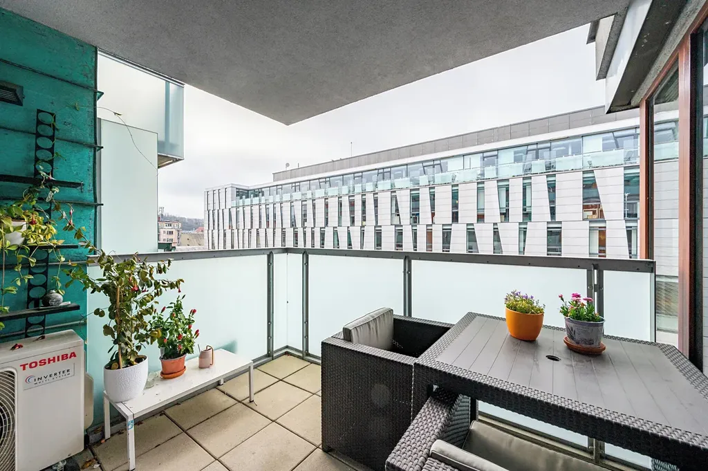 K pronájmu krásný byt 2+kk 60 m2 s terasou 7 m2, včetně garážového stání a sklepa 4 m2, v luxusní rezidenci River Diamond, přímo v atraktivní lokalitě Karlín na Rohanském nábřeží.