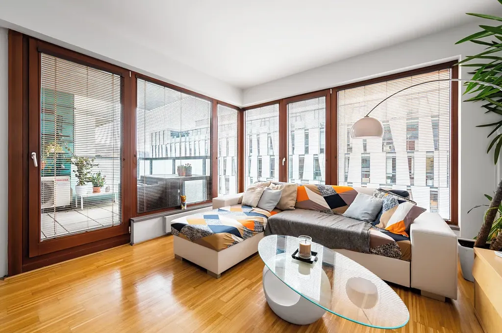 Dispozici bytu tvoří předsíň s vestavěnou skříní, prostorný obývací pokoj, jídelní část s kuchyňským koutem, plně vybavená spotřebiči, ložnice včetně postele, koupelna s vanou a samostatné WC. Podlahy dřevěné, vnitřní žaluzie, klimatizace, domácí telefon.