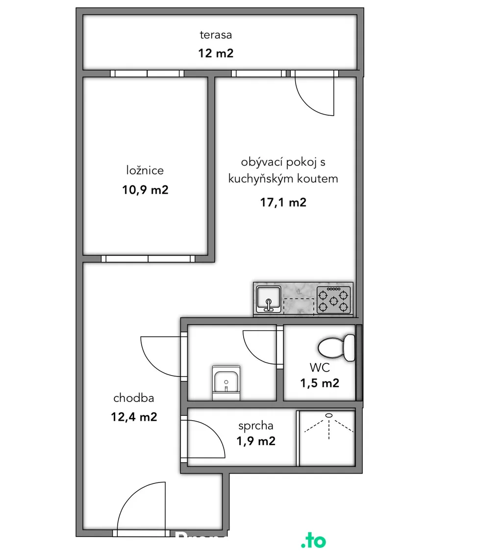 Oddělená ložnice poskytuje dostatek soukromí. Prostorná vstupní chodba s vestavěnou skříní nabízí nadstandardní úložné možnosti bez nutnosti dalších zásahů do interiéru. Terasa přirozeně rozšiřuje obytný prostor směrem ven a vytváří plnohodnotné místo pro posezení, relax i práci z domova.