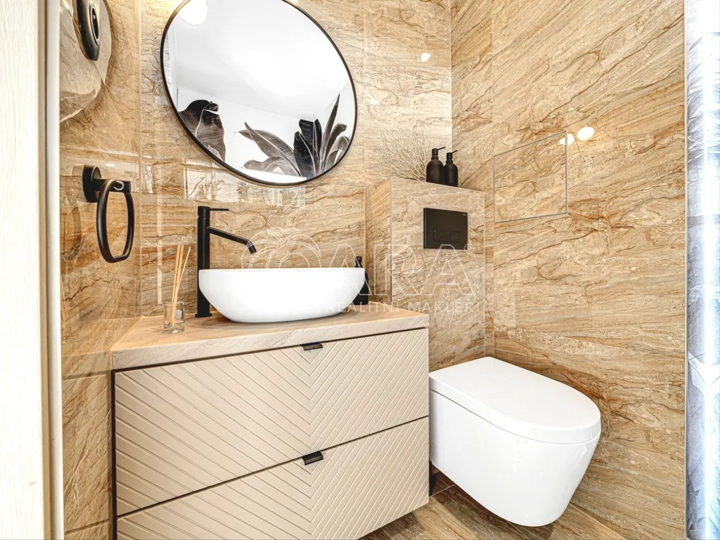 V koupelně najdete moderní vanu, elegantní kombinaci dlaždic a světla, která působí mimořádně útulně. Vše v jednotném designu a bez kompromisů v kvalitě.
