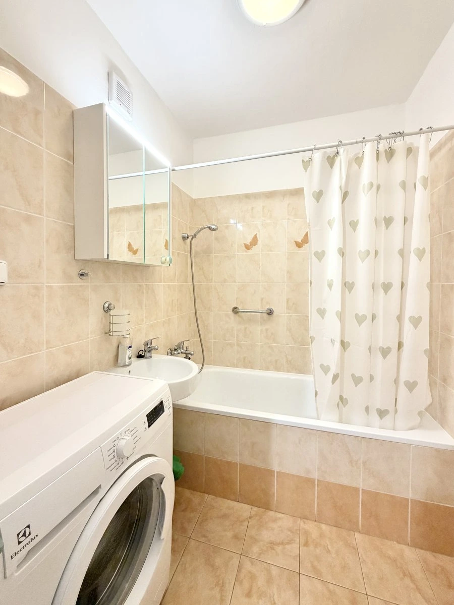 Byt se nabízí plně vybavený. Kuchyně disponuje lednicí, myčkou, elektrickým sporákem, mikrovlnnou troubou a digestoří. Obývací část je zařízena pohovkou, konferenčním stolem, skříněmi, jídelním stolem a židlemi. Součástí ložnice je postel, pracovní stůl s židlí a šatní skříň. V koupelně je vana, umyvadlo a pračka. Toaleta je umístěna samostatně.