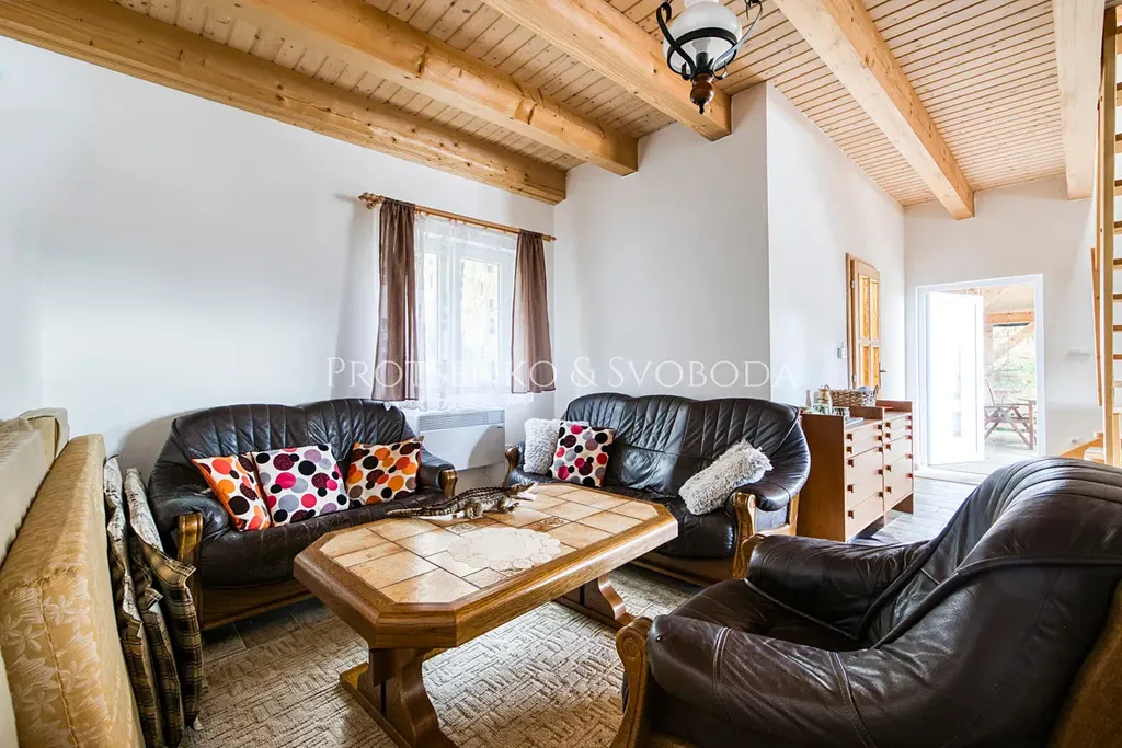 • Přízemí: velký obytný prostor s krbovými kamny, navazující kuchyňský kout plně vybavený včetně dvou lednic, a praktické zázemí.