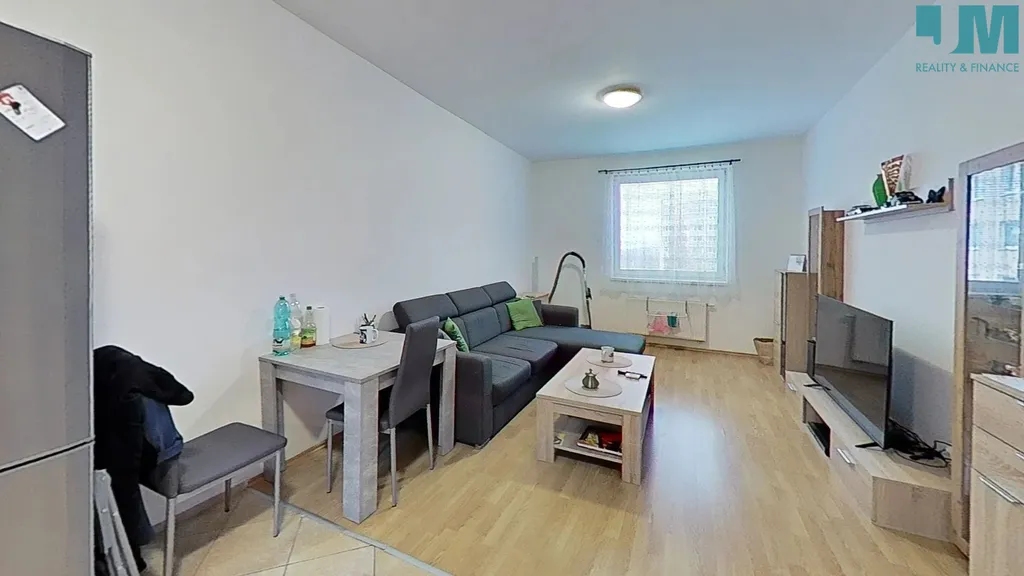 Dispozice a vybavení: Obývací pokoj s kuchyňským koutem tvoří hlavní obytný prostor bytu. Kuchyňská linka je plně vybavena spotřebiči: sklokeramická varná deska, elektrická trouba, digestoř, myčka nádobí a vestavná mikrovlnná trouba. Součástí vybavení zůstává jídelní stůl se židlemi, který vytváří příjemné místo pro stolování.